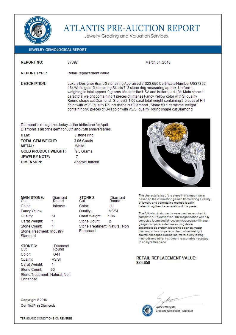 REF-390A9X -37392 ---- 3.06 CTW Intense Fancy Yellow Diamond Art Deco 3 Stone Ring 18K White Gold ---- Luxury Designer Brand 3 stone ring Appraised at $23,650 Certificate Number US37392 18k White gold, 3 stone ring Size is 7, 3 stone ring measuring approx. Uniform, weighing in total approx. 9 grams. Made in the USA and is stamped 18k, Main stone 1 carat total weight containing 1 pieces of Intense Fancy Yellow color with SI quality Round shape cut Diamond , Stone #2 1.06 carat total weight containing 2 pieces of H-I color with VS/SI quality Round shape cut Diamond , Stone #3 1 carat total weight containing 90 pieces of G-H color with VS/SI quality Round shape cut Diamond