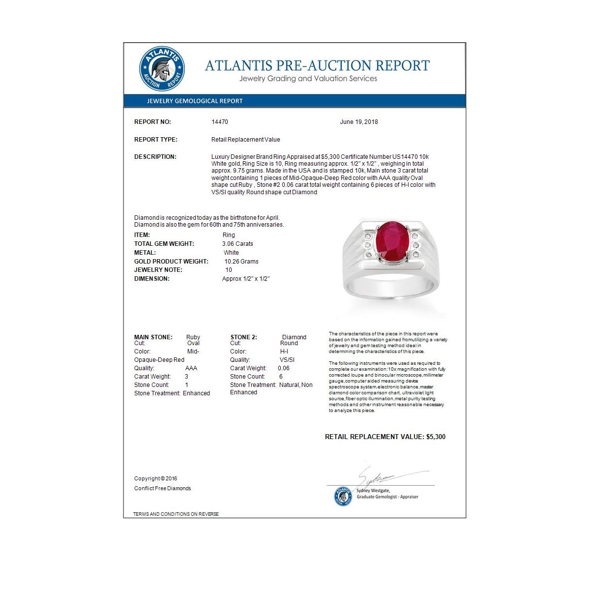 REF-73Y8K -14470 ---- 3.06 CTW Ruby & Diamond Men's Ring 10K White Gold ---- Luxury Designer Brand Ring Appraised at $5,300 Certificate Number US14470 10k White gold, Ring Size is 10, Ring measuring approx. 1/2" x 1/2" , weighing in total approx. 9.75 grams. Made in the USA and is stamped 10k, Main stone 3 carat total weight containing 1 pieces of Mid-Opaque-Deep Red color with AAA quality Oval shape cut Ruby , Stone #2 0.06 carat total weight containing 6 pieces of H-I color with VS/SI quality Round shape cut Diamond