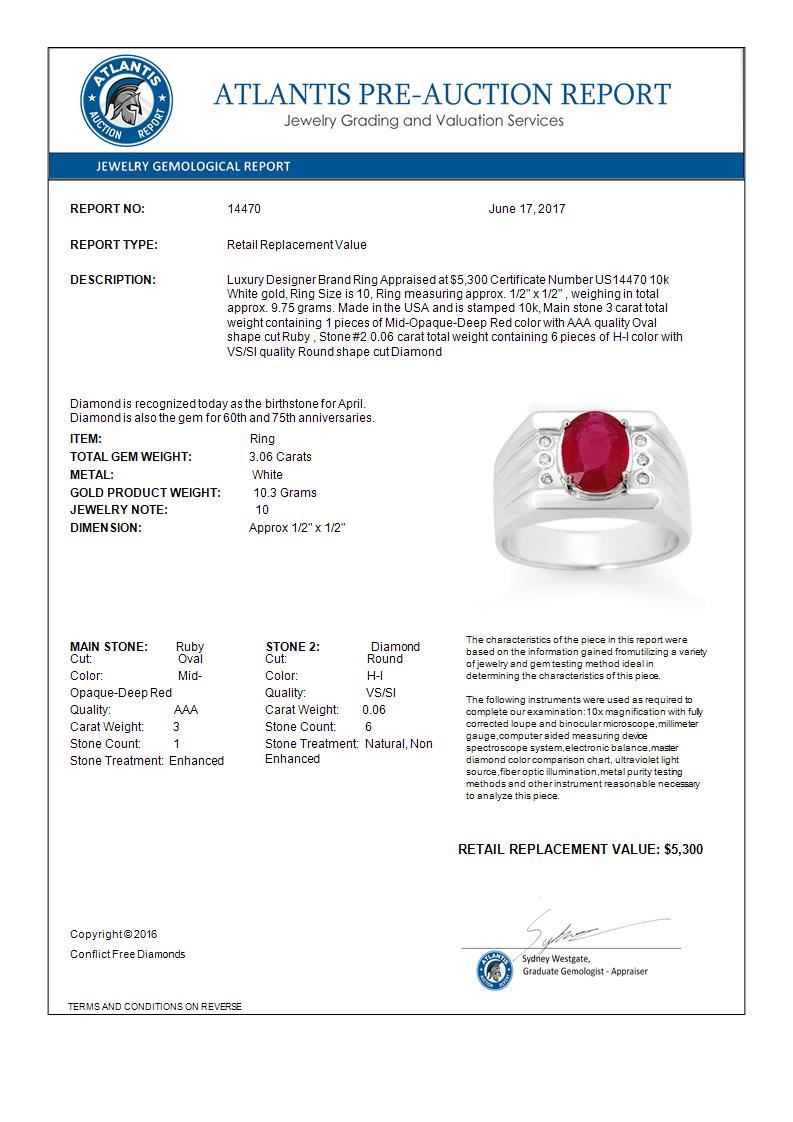 3.06 CTW Ruby & Diamond Mens Ring 10K White Gold ---- Luxury Designer Brand Ring Appraised Retail Price at $5,300 ---- SKU Number US14470 10k White gold Ring Size is 10, Ring measuring approx. 1/2" x 1/2" , weighing in total approx. 9.75 grams. Made in the USA and is stamped 10k, Main stone 3 carat total weight containing 1 pieces of Mid-Opaque-Deep Red color with AAA quality Oval shape cut Ruby , Stone #2 0.06 carat total weight containing 6 pieces of H-I color with VS/SI quality Round shape cut