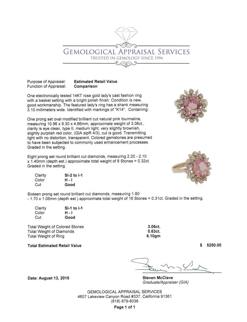 One electronically tested 14KT rose gold lady's cast fashion ring with a basket setting with a bright polish finish. The featured lady's ring has a shank measuring 3.10 millimeters wide. Identified with markings of "K14". Condition is new, good workmanship. Containing: One prong set oval modified brilliant cut natural pink tourmaline, measuring 10.96 x 9.30 x 4.66mm, approximate weight of 3.06ct., clarity is eye clean, type II, medium light, very slightly brownish, slightly purplish red color, (GIA slpR 4/3), cut is good. Transmitting light with no distortion, transparent. Colored gemstones are presumed to have been subjected to commonly used enhancement processes. Graded in the setting. Eight prong set round brilliant cut diamonds, measuring 2.20 - 2.10 x 1.40mm (depth est.) approximate total weight of 8 Stones = 0.32ct. Graded in the setting. Clarity: SI-2 to I-1. Color: H - I. Cut Good Sixteen prong set round brilliant cut diamonds, measuring 1.80 - 1.70 x 1.05mm (depth est.) approximate total weight of 16 Stones = 0.31ct. Graded in the setting. Clarity: SI-1 to I-1. Color: H - I. Cut Good. Total Weight of Colored Stones 3.06ct. Total Weight of Diamonds 0.63ct. Total Weight of Ring 6.10gm. GAS Appraised.