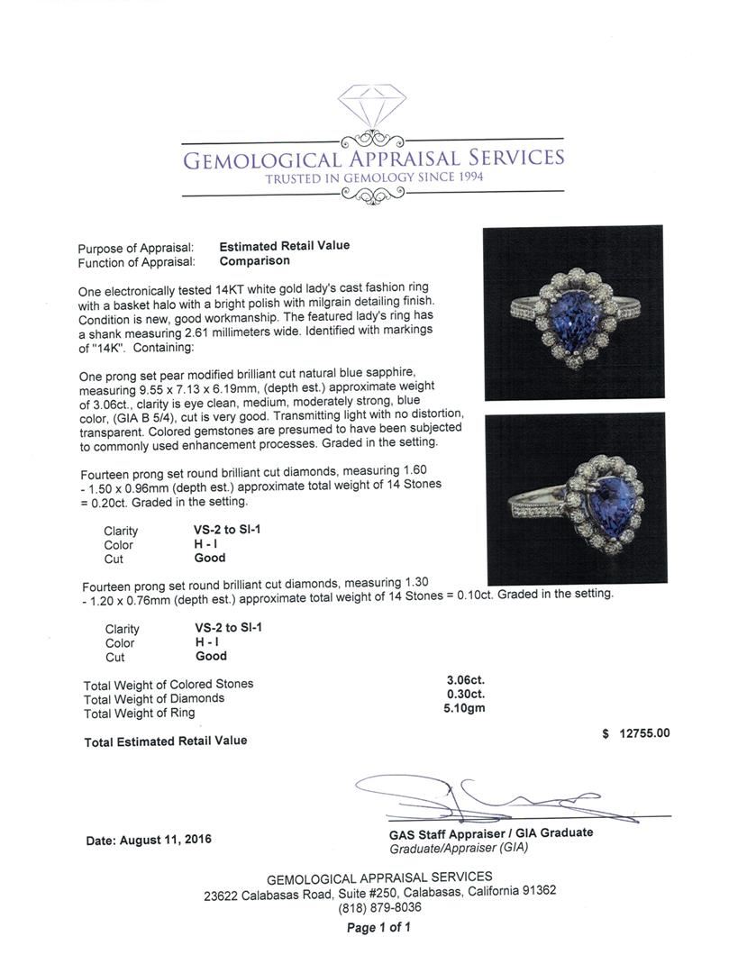 One electronically tested 14KT white gold lady's cast fashion ring with a basket halo with a bright polish with milgrain detailing finish. The featured lady's ring has a shank measuring 2.61 millimeters wide. Identified with markings of '14K'. Condition is new, good workmanship. Containing: One prong set pear modified brilliant cut natural blue sapphire, measuring 9.55 x 7.13 x 6.19mm, (depth est.) approximate weight of 3.06ct., clarity is eye clean, medium, moderately strong, blue color, (GIA B 5/4), cut is very good. Transmitting light with no distortion, transparent. Colored gemstones are presumed to have been subjected to commonly used enhancement processes. Graded in the setting. Fourteen prong set round brilliant cut diamonds, measuring 1.60 - 1.50 x 0.96mm (depth est.) approximate total weight of 14 Stones = 0.20ct. Graded in the setting. Clarity VS-2 to SI-1. Color: H - I Cut Good Fourteen prong set round brilliant cut diamonds, measuring 1.30 - 1.20 x 0.76mm (depth est.) approximate total weight of 14 Stones = 0.10ct. Graded in the setting. Clarity VS-2 to SI-1. Color: H - I Cut Good. Total Weight of Colored Stones 3.06ct.. Total Weight of Diamonds 0.30ct.. Total Weight of Ring 5.10gm. GAS Appraised at $12,755.00.