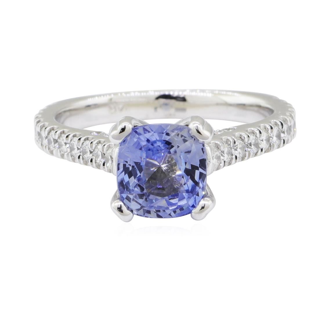 One electronically tested 14KT white gold lady's cast fashion ring with a cathedral European shank with a bright polish finish. The featured lady's ring has a shank measuring 2.40 millimeters wide. Identified with markings of '14K'. Condition is new, good workmanship. Containing: One prong set square cushion modified brilliant cut natural blue sapphire, measuring 7.40 x 6.95 x 4.50mm, (depth est.) 3%. bulge factor, approximate weight of 2.26ct., clarity is eye clean, medium light, moderately strong, blue color, (GIA B 4/4), cut is good. Transmitting light with no distortion, transparent. Colored gemstones are presumed to have been subjected to commonly used enhancement processes. Graded in the setting. Twenty-Four prong set round brilliant cut diamonds, measuring 1.80 - 1.75 x 1.11mm (depth est.) approximate total weight of 24 Stones = 0.55ct. Graded in the setting. Color G - I Clarity VS-2 to SI-1 Cut Very Good Sixteen prong set round brilliant cut diamonds, measuring 1.60 - 1.55 x 0.98mm (depth est.) approximate total weight of 16 Stones = 0.25ct. Graded in the setting. Color G - H Clarity VS-2 to SI-1 Cut Very Good. Total Weight of Colored Stones 2.26ct.. Total Weight of Diamonds 0.80ct.. Total Weight of Ring 5.80gm GAS Appraised at $6515.00. GAS Appraised at $6,515.00.