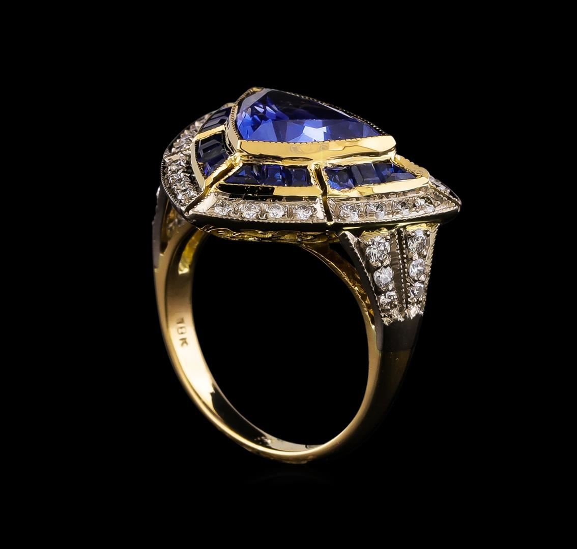 One electronically tested 18KT yellow gold ladies cast sapphire and diamond ring. The featured sapphire is set within a sapphire and diamond bezel supported by a filigree lattice under gallery and diamond set shoulders, completed by a two millimeter wide band. Bright polish finish with milgrain detailing and rhodium accents. Identified with markings of '18K'. Condition is good. Containing: One prong set triangle mixed cut natural blue sapphire, measuring 9.20 x 8.30 x 4.20mm, approximate weight of 2.50ct., clarity is slightly included, type II, medium, slightly grayish, violetish blue color, (GIA vB 5/2), cut is good. Transmitting light with a minimum of distortion, transparent. Naturally occurring internal & external characteristics are present. Graded in the setting. Eighteen channel set square and trapezoid step cut natural blue sapphires approximate total weight of 0.56ct., clarity is eye clean, type II, medium dark, very slightly grayish, blue color, (GIA B 6/3), cut is good. Transmitting light with no distortion, transparent. Color grade is an average for the group. Graded in the setting. Thirty-Eight prong set round brilliant and single cut diamonds approximate total weight of 38 Stones = 0.44ct. The color grade reflects the entire range of clarity for this group. Graded in the setting. Clarity SI-1 to I-2. Color: F - H. Total Weight of Colored Stones 3.06ct.. Total Weight of Diamonds 0.44ct.. Total Weight of Ring 6.02gm. AIG Appraised at $5,355.00.