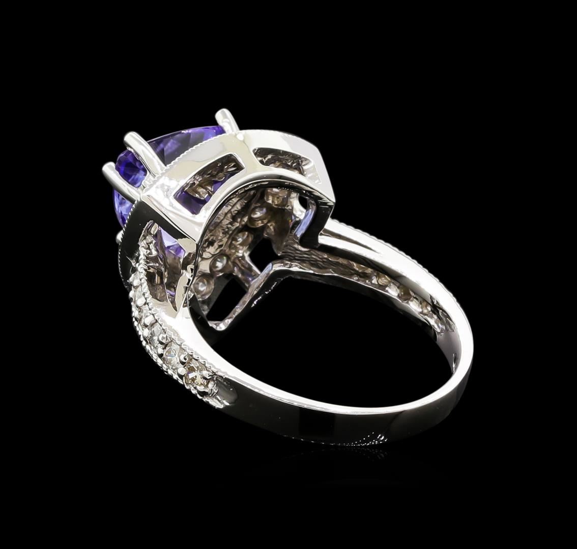 One electronically tested 14KT white gold lady's cast fashion ring with a cathedral shank with a bright polish with milgrain detailing finish. The featured lady's ring has a shank measuring 2.57 millimeters wide. Identified with markings of "K14". Condition is new, good workmanship. Containing: One prong set triangle modified brilliant cut natural tanzanite, measuring 9.30 x 9.10 x 5.86mm, approximate weight of 3.06ct., clarity is eye clean, type I, medium, very slightly grayish, bluish violet color, (GIA bV 5/3), cut is very good. Transmitting light with no distortion, transparent. Colored gemstones are presumed to have been subjected to commonly used enhancement processes. Graded in the setting. Thirty prong set round brilliant cut diamonds, measuring 1.90 - 1.80 x 1.17mm (depth est.) approximate total weight of 30 Stones = 0.74ct. Graded in the setting. Clarity: SI-1 to I-1. Color: H - I. Cut Good. Total Weight of Colored Stones 3.06ct. Total Weight of Diamonds 0.74ct. Total Weight of Ring 5.60gm. GAS Appraised at $7,725.00.