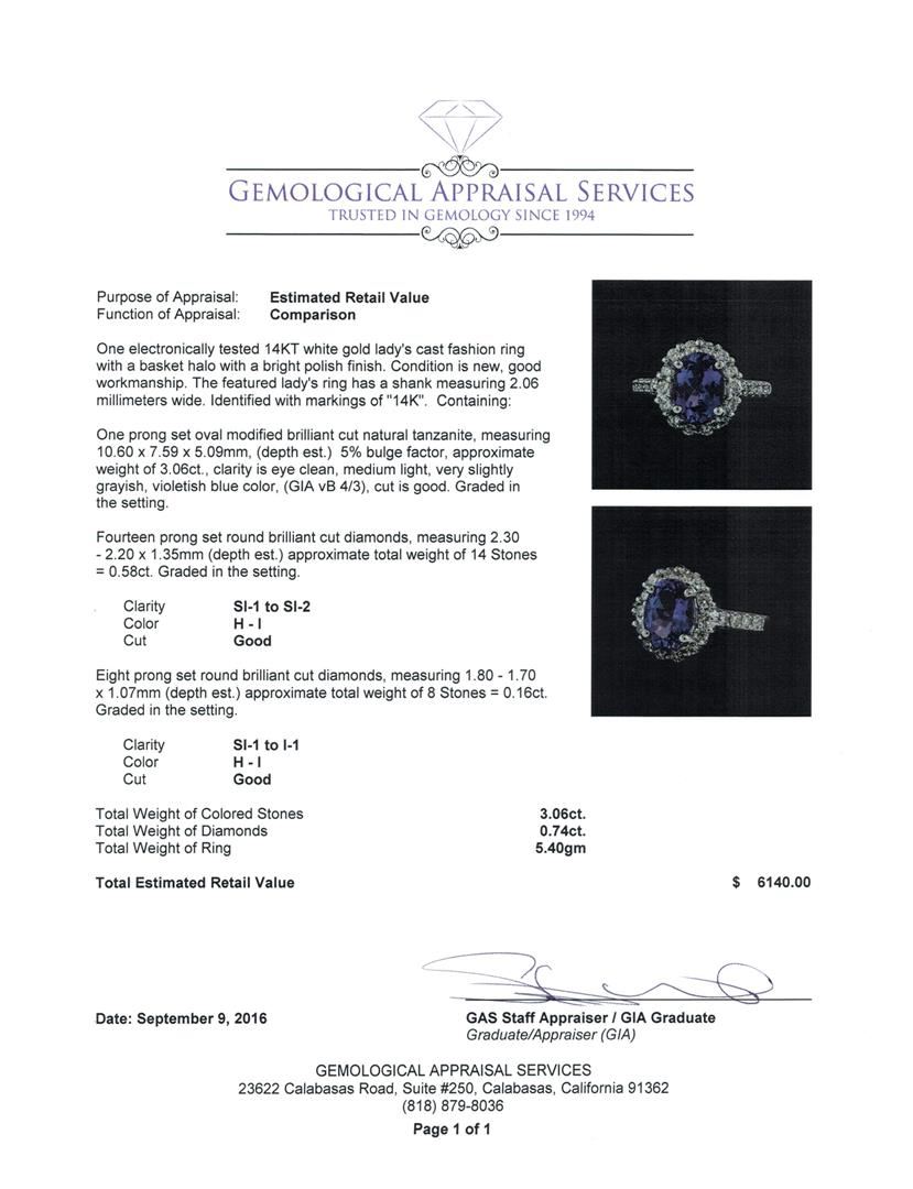 One electronically tested 14KT white gold lady's cast fashion ring with a basket halo with a bright polish finish. The featured lady's ring has a shank measuring 2.06 millimeters wide. Identified with markings of '14K'. Condition is new, good workmanship. Containing: One prong set oval modified brilliant cut natural tanzanite, measuring 10.60 x 7.59 x 5.09mm, (depth est.) 5%. bulge factor, approximate weight of 3.06ct., clarity is eye clean, medium light, very slightly grayish, violetish blue color, (GIA vB 4/3), cut is good. Graded in the setting. Fourteen prong set round brilliant cut diamonds, measuring 2.30 - 2.20 x 1.35mm (depth est.) approximate total weight of 14 Stones = 0.58ct. Graded in the setting. Clarity SI-1 to SI-2. Color: H - I Cut Good Eight prong set round brilliant cut diamonds, measuring 1.80 - 1.70 x 1.07mm (depth est.) approximate total weight of 8 Stones = 0.16ct. Graded in the setting. Clarity SI-1 to I-1. Color: H - I Cut Good. Total Weight of Colored Stones 3.06ct.. Total Weight of Diamonds 0.74ct.. Total Weight of Ring 5.40gm GAS Appraised at $6,140.00.