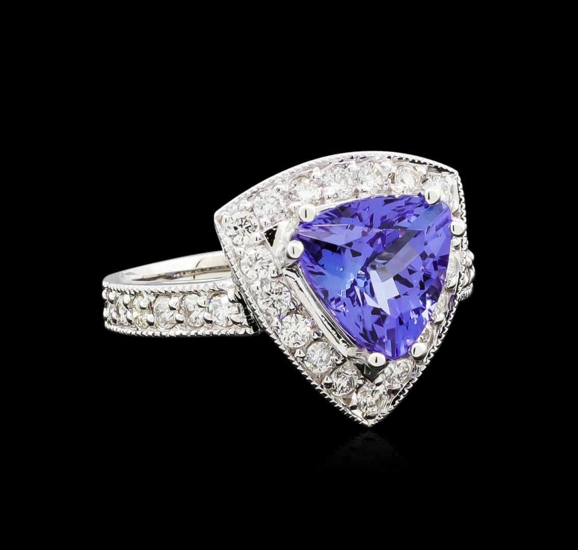 One electronically tested 14KT white gold lady's cast fashion ring with a cathedral shank with a bright polish with milgrain detailing finish. The featured lady's ring has a shank measuring 2.57 millimeters wide. Identified with markings of "K14". Condition is new, good workmanship. Containing: One prong set triangle modified brilliant cut natural tanzanite, measuring 9.30 x 9.10 x 5.86mm, approximate weight of 3.06ct., clarity is eye clean, type I, medium, very slightly grayish, bluish violet color, (GIA bV 5/3), cut is very good. Transmitting light with no distortion, transparent. Colored gemstones are presumed to have been subjected to commonly used enhancement processes. Graded in the setting. Thirty prong set round brilliant cut diamonds, measuring 1.90 - 1.80 x 1.17mm (depth est.) approximate total weight of 30 Stones = 0.74ct. Graded in the setting. Clarity: SI-1 to I-1. Color: H - I. Cut Good. Total Weight of Colored Stones 3.06ct. Total Weight of Diamonds 0.74ct. Total Weight of Ring 5.60gm. GAS Appraised at $7,725.00.