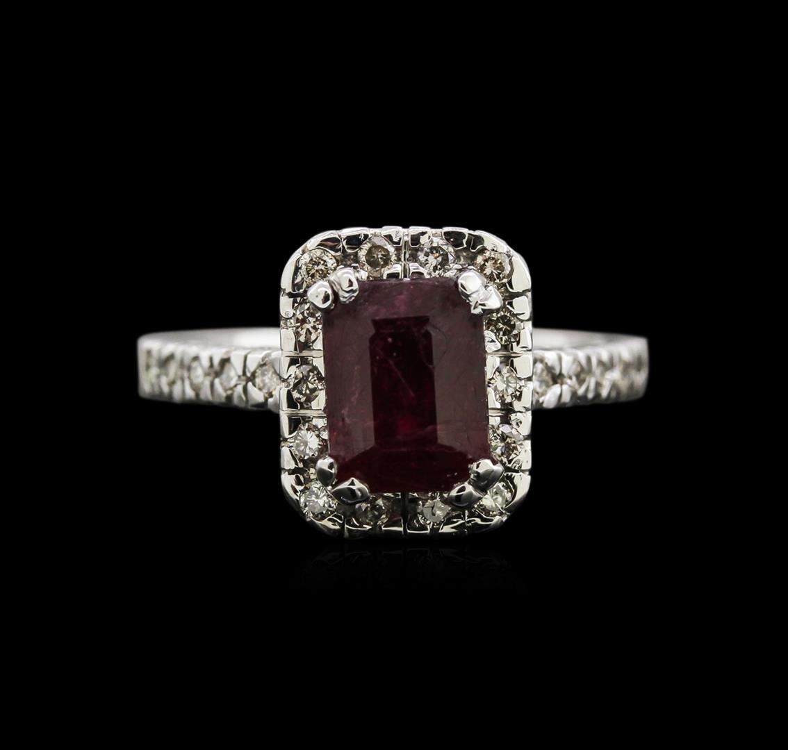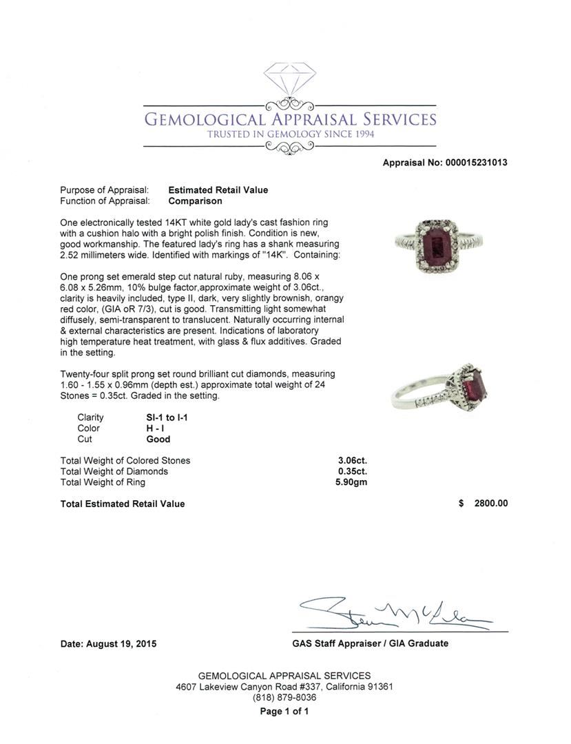 One electronically tested 14KT white gold lady's cast fashion ring with a cushion halo with a bright polish finish. The featured lady's ring has a shank measuring 2.52 millimeters wide. Identified with markings of "14K". Condition is new, good workmanship. Containing: One prong set emerald step cut natural ruby, measuring 8.06 x 6.08 x 5.26mm, 10% bulge factor, approximate weight of 3.06ct., clarity is heavily included, type II, dark, very slightly brownish, orangy red color, (GIA oR 7/3), cut is good. Transmitting light somewhat diffusely, semi-transparent to translucent. Naturally occurring internal & external characteristics are present. Indications of laboratory high temperature heat treatment, with glass & flux additives. Graded in the setting. Twenty-Four split prong set round brilliant cut diamonds, measuring 1.60 - 1.55 x 0.96mm (depth est.) approximate total weight of 24 Stones = 0.35ct. Graded in the setting. Clarity: SI-1 to I-1. Color: H - I. Cut Good. Total Weight of Colored Stones 3.06ct. Total Weight of Diamonds 0.35ct. Total Weight of Ring 5.90gm. GAS Appraised at $2,800.00.