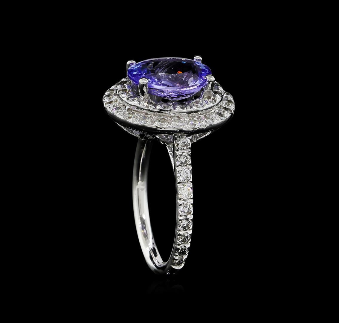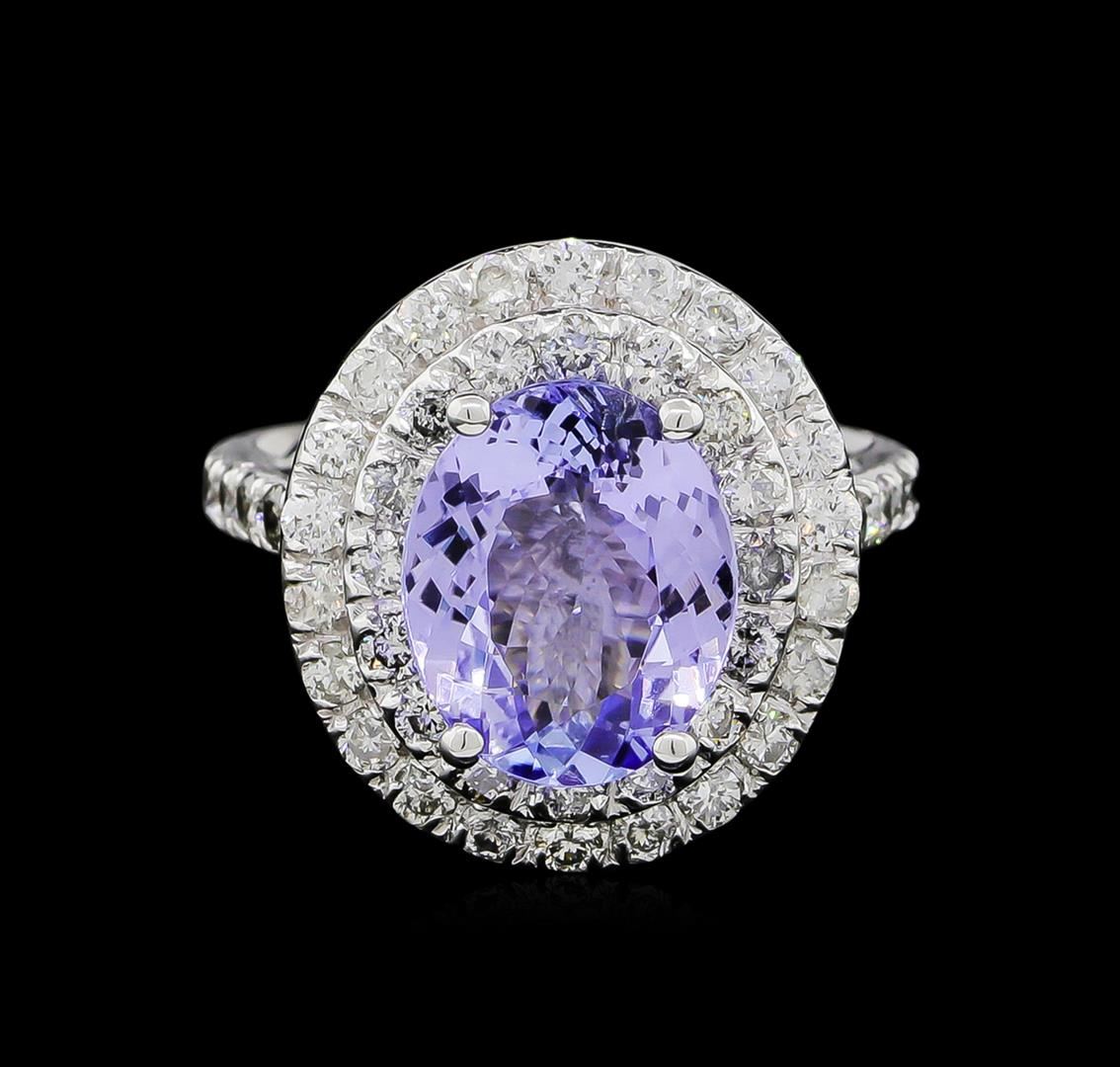One electronically tested 14KT white gold ladies cast tanzanite & diamond ring with a bright finish. The featured tanzanite is set within tiered diamond bezels, supported by diamond set shoulders, completed by a three millimeter wide band. Identified with markings of "14K". Condition is new, good workmanship. Containing: One prong set oval mixed cut natural tanzanite, measuring 11.00 x 9.00 x 4.40mm, approximate weight of 3.06ct., clarity is eye clean, type I, medium light, slightly grayish, bluish violet color, (GIA bV 4/2), cut is good. Transmitting light with no distortion, transparent. Refractive index testing results of 1.70. This is a conclusive result for Tanzanite. Graded in the setting. Tanzanite is a very rare gemstone that is only found in the country of Tanzania. Originally discovered in 1967. Tiffany & Company, named the stone Tanzanite. It is found in the Usumburu Mountains that border the Umba Valley of northern Tanzania. Tanzanite occurs in gray, brown, violet, blue, reddish-purple, & green. The gem is interesting because of its exceptional pleochroism. Rotated in different directions a tanzanite will exhibit multiple changes of color. Tanzanite has a low tolerance to ultrasonic cleaning, and should not be cleaned using this method. Fifty-Six prong set round brilliant cut diamonds, measuring 1.80 - 1.60 x 1.02mm (depth est.) approximate total weight of 56 Stones = 1.01ct. Graded in the setting. Clarity: SI-1 to I-1. Color: F - H. Total Weight of Colored Stones 3.06ct. Total Weight of Diamonds 1.01ct. Total Weight of Ring 6.34gm. AIG Appraised at $7,915.00.