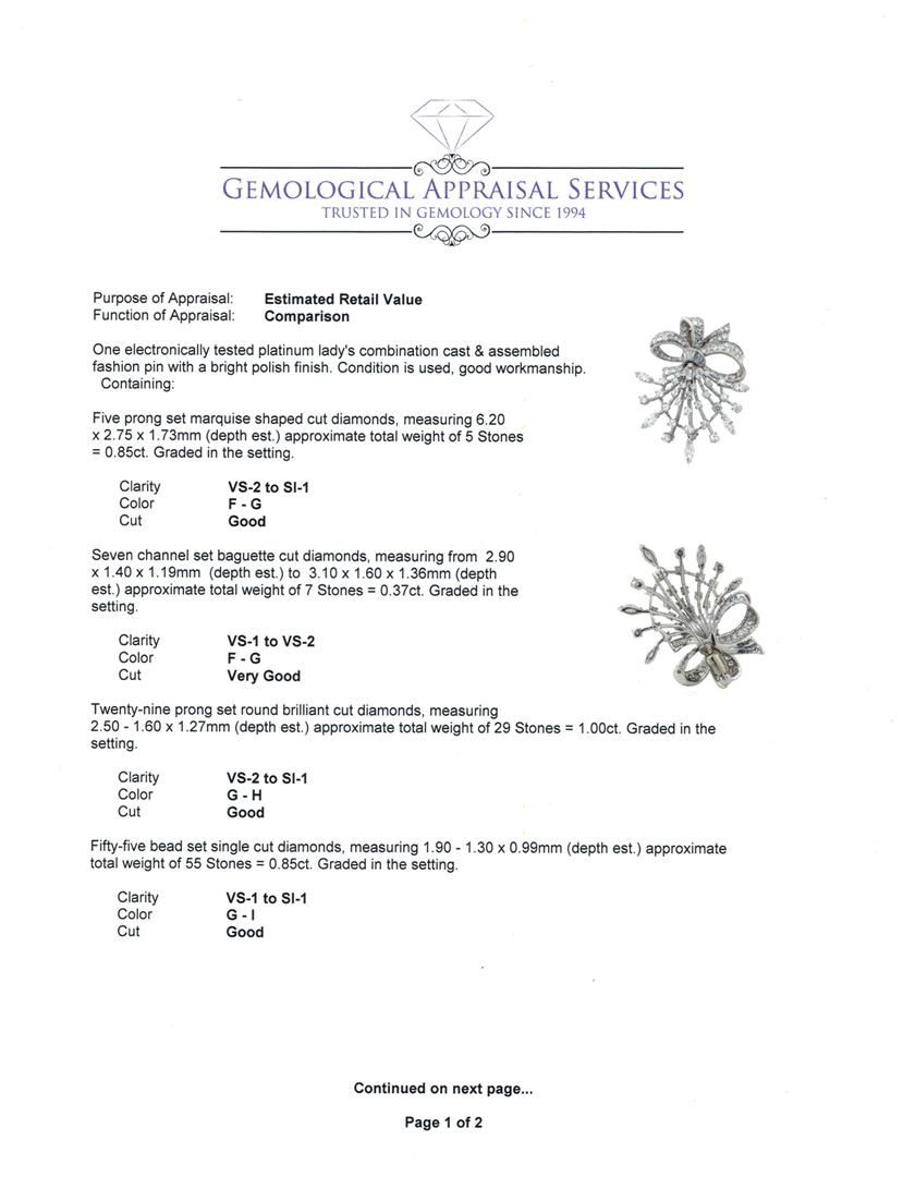 One electronically tested platinum lady's combination cast & assembled fashion pin with a bright polish finish. Condition is used, good workmanship. Containing: Five prong set marquise shaped cut diamonds, measuring 6.20 x 2.75 x 1.73mm (depth est.) approximate total weight of 5 Stones = 0.85ct. Graded in the setting. Clarity: VS-2 to SI-1. Color: F - Good Seven channel set baguette cut diamonds, measuring from 2.90 x 1.40 x 1.19mm (depth est.) to 3.10 x 1.60 x 1.36mm (depth est.) approximate total weight of 7 Stones = 0.37ct. Graded in the setting. Clarity: VS-1 to VS-2. Color: F - Very Good Twenty-Nine prong set round brilliant cut diamonds, measuring 2.50 - 1.60 x 1.27mm (depth est.) approximate total weight of 29 Stones = 1.00ct. Graded in the setting. Clarity: VS-2 to SI-1. Color: G - Good Fifty-Five bead set single cut diamonds, measuring 1.90 - 1.30 x 0.99mm (depth est.) approximate total weight of 55 Stones = 0.85ct. Graded in the setting. Clarity: VS-1 to SI-1. Color: G - I. Cut Good. Total Weight of Diamonds 3.07ct. Total Weight of Pin 21.00gm. GAS Appraised at $8,980.00.