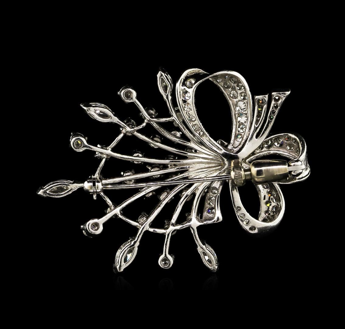 One electronically tested platinum lady's combination cast & assembled fashion pin with a bright polish finish. Condition is used, good workmanship. Containing: Five prong set marquise shaped cut diamonds, measuring 6.20 x 2.75 x 1.73mm (depth est.) approximate total weight of 5 Stones = 0.85ct. Graded in the setting. Clarity: VS-2 to SI-1. Color: F - Good Seven channel set baguette cut diamonds, measuring from 2.90 x 1.40 x 1.19mm (depth est.) to 3.10 x 1.60 x 1.36mm (depth est.) approximate total weight of 7 Stones = 0.37ct. Graded in the setting. Clarity: VS-1 to VS-2. Color: F - Very Good Twenty-Nine prong set round brilliant cut diamonds, measuring 2.50 - 1.60 x 1.27mm (depth est.) approximate total weight of 29 Stones = 1.00ct. Graded in the setting. Clarity: VS-2 to SI-1. Color: G - Good Fifty-Five bead set single cut diamonds, measuring 1.90 - 1.30 x 0.99mm (depth est.) approximate total weight of 55 Stones = 0.85ct. Graded in the setting. Clarity: VS-1 to SI-1. Color: G - I. Cut Good. Total Weight of Diamonds 3.07ct. Total Weight of Pin 21.00gm. GAS Appraised at $8,980.00.