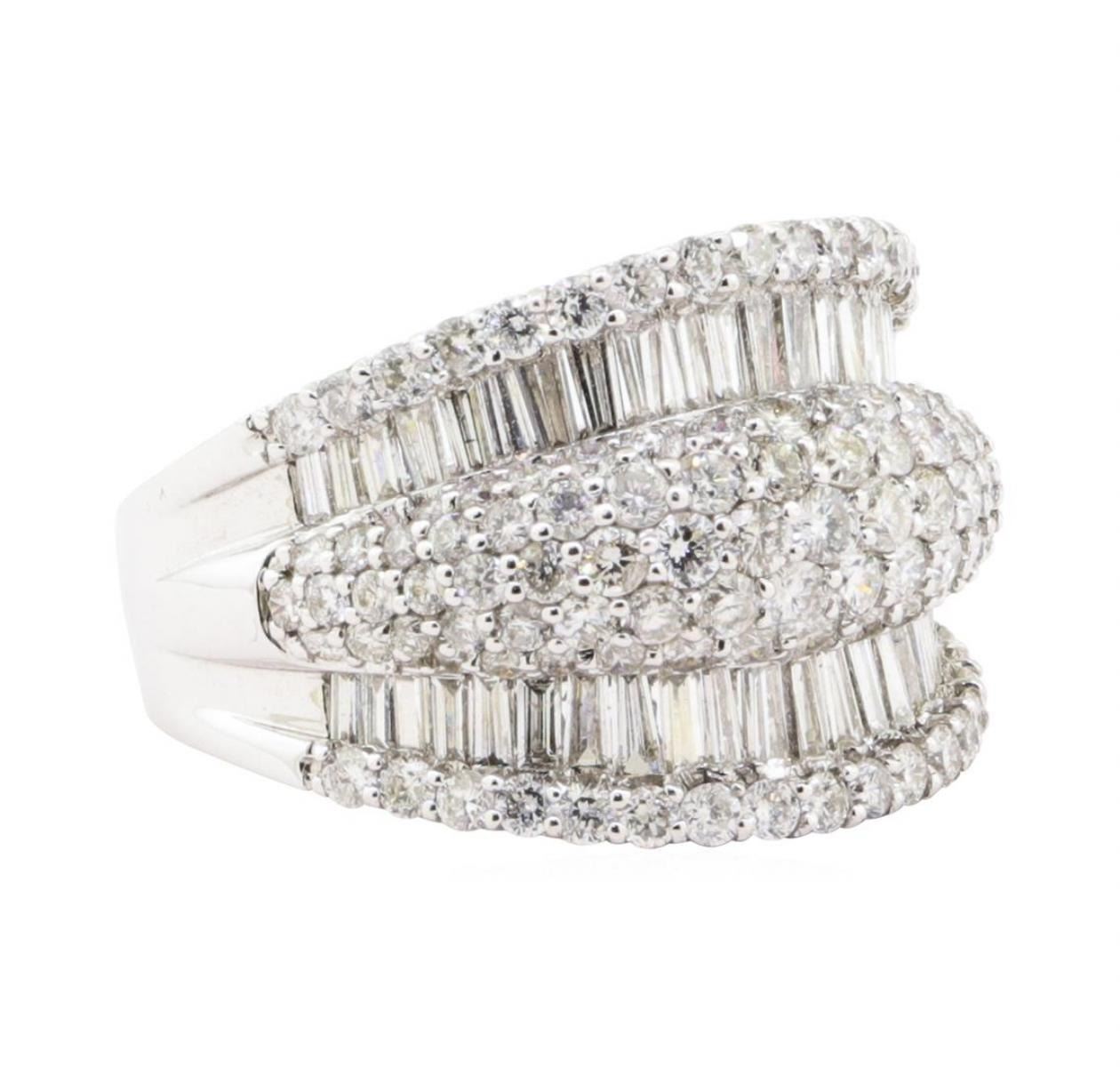 One electronically tested 18KT white gold lady's cast fashion ring with a tapered pave dome with a bright polish finish. The featured lady's ring has a shank measuring 4.00 millimeters wide. Identified with markings of '18K 750'. Condition is new, good workmanship. Containing: Forty-Six channel set baguette cut (tapered) diamonds, measuring from 2.50 x 1.10 x 0.94mm (depth est.) to 2.60 x 1.20 x 1.02mm (depth est.) approximate total weight of 46 Stones = 1.18ct. Graded in the setting. Color H - I Clarity VS-2 to SI-2 Cut Good Ninety prong set round brilliant cut diamonds, measuring 2.20 - 1.40 x 1.08mm (depth est.) approximate total weight of 90 Stones = 1.89ct. Graded in the setting. Color H - I Clarity SI-1 to SI-3 Cut Good. Total Weight of Diamonds 3.07ct.. Total Weight of Ring 8.30gm GAS Appraised at $9305.00. GAS Appraised.