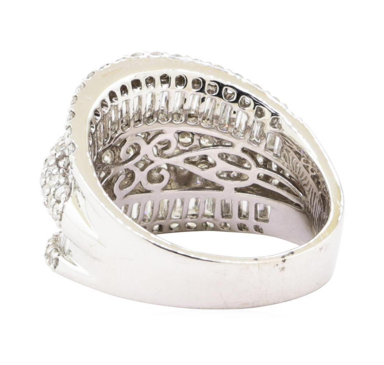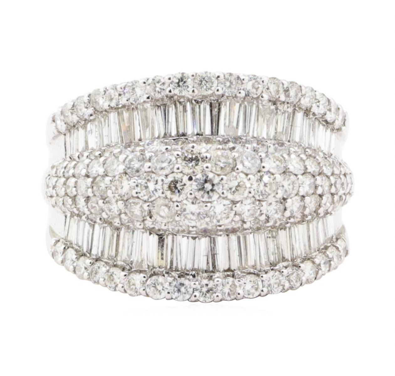 One electronically tested 18KT white gold lady's cast fashion ring with a tapered pave dome with a bright polish finish. The featured lady's ring has a shank measuring 4.00 millimeters wide. Identified with markings of '18K 750'. Condition is new, good workmanship. Containing: Forty-Six channel set baguette cut (tapered) diamonds, measuring from 2.50 x 1.10 x 0.94mm (depth est.) to 2.60 x 1.20 x 1.02mm (depth est.) approximate total weight of 46 Stones = 1.18ct. Graded in the setting. Color H - I Clarity VS-2 to SI-2 Cut Good Ninety prong set round brilliant cut diamonds, measuring 2.20 - 1.40 x 1.08mm (depth est.) approximate total weight of 90 Stones = 1.89ct. Graded in the setting. Color H - I Clarity SI-1 to SI-3 Cut Good. Total Weight of Diamonds 3.07ct.. Total Weight of Ring 8.30gm GAS Appraised at $9305.00. GAS Appraised.