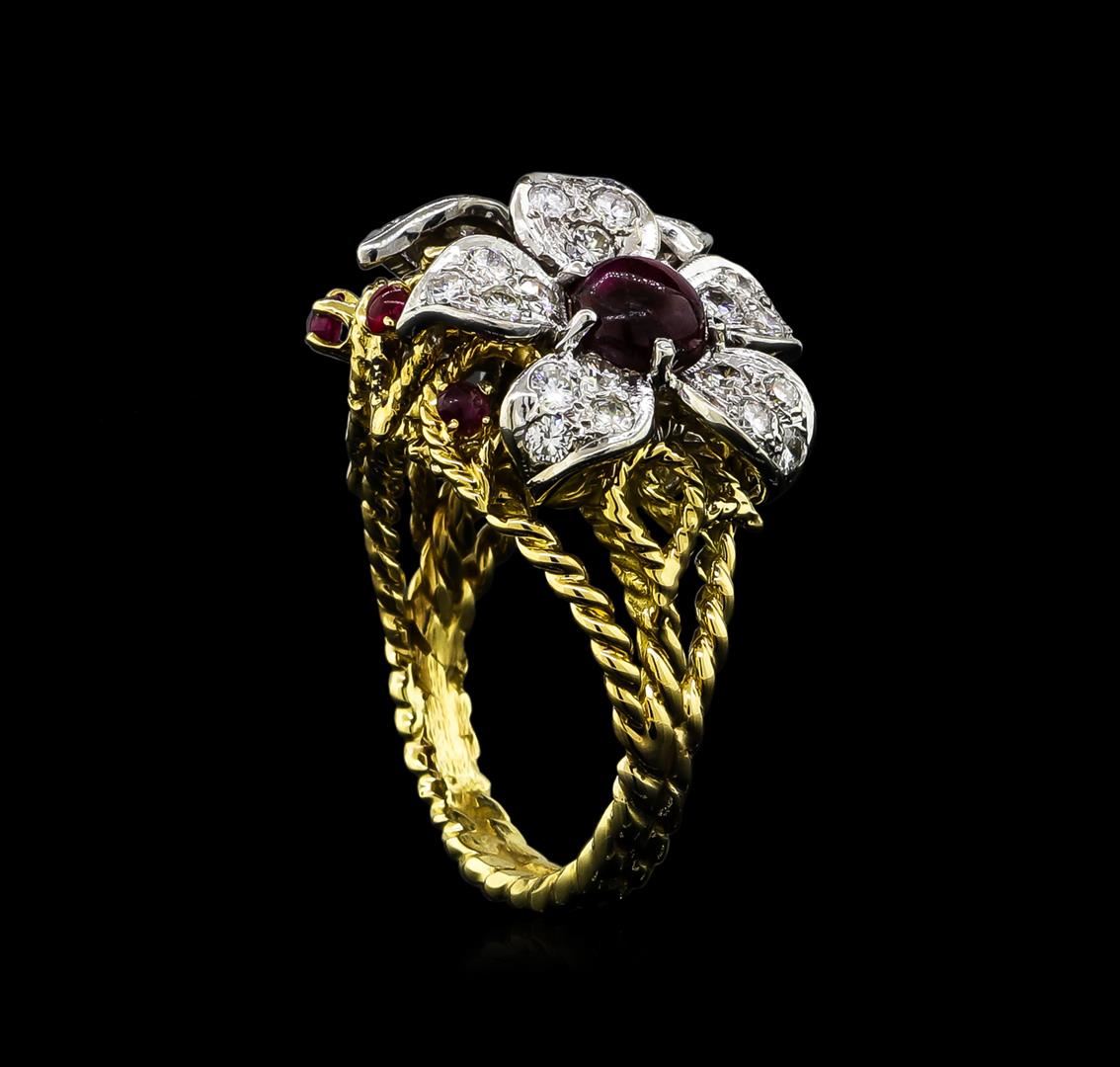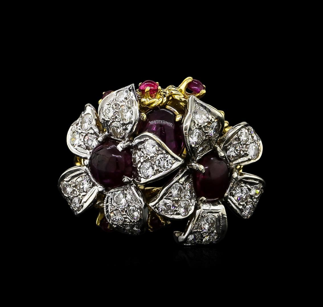 One electronically tested 18KT white and yellow gold ladies cast & assembled ruby and diamond flower ring. The ring features two ruby and diamond set flowers supported by an elaborate ruby accented under gallery and three-way split shoulders, completed by a three millimeter wide band. Bright polish finish with rope and milgrain detailing. Condition is good. Containing: One prong set oval cabochon cut natural ruby, measuring 6.50 x 5.50 x 1.95mm, approximate weight of 0.85ct., clarity is heavily included, type II, medium dark, very slightly brownish, slightly purplish red color, (GIA slpR 6/3), cut is good. Transmitting light somewhat diffusely, translucent. Naturally occurring internal & external characteristics are present. Graded in the setting. Two prong set round cabochon cut natural rubies, measuring 5.80 x 5.70 x 2.40mm, approximate total weight of 1.82ct., clarity is heavily included, type II, medium dark, very slightly brownish, slightly purplish red color, (GIA slpR 6/3), cut is good. Transmitting light somewhat diffusely, translucent. Naturally occurring internal & external characteristics are present. Color grade is an average for the pair. Graded in the setting. Five prong set round cabochon cut natural rubies, measuring 2.50 x 2.40 x 1.00mm, approximate total weight of 0.40ct., clarity is heavily included, type II, medium dark, very slightly brownish, slightly purplish red color, (GIA slpR 6/3), cut is good. Transmitting light somewhat diffusely, translucent. Naturally occurring internal & external characteristics are present. Color grade is an average for the group. Graded in the setting. Forty bead set round brilliant cut diamonds, measuring 2.20 - 2.00 x 1.26mm (depth est.) approximate total weight of 40 Stones = 1.45ct. Graded in the setting. Clarity: SI-1 to I-1. Color: G - I. Total Weight of Colored Stones 3.07ct. Total Weight of Diamonds 1.45ct. Total Weight of Ring 15.53gm. AIG Appraised at $8,215.00.