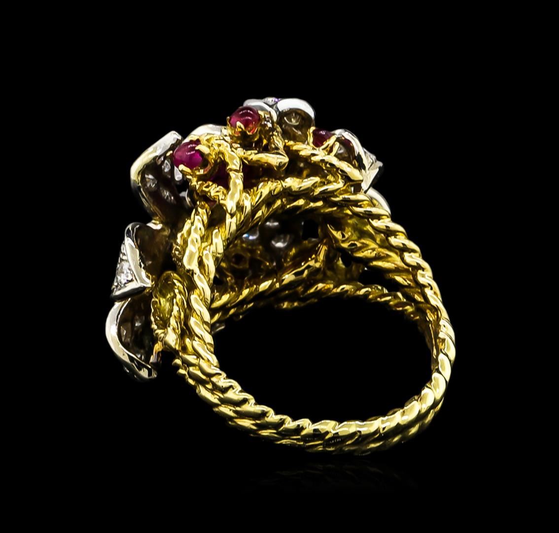One electronically tested 18KT white and yellow gold ladies cast & assembled ruby and diamond flower ring. The ring features two ruby and diamond set flowers supported by an elaborate ruby accented under gallery and three-way split shoulders, completed by a three millimeter wide band. Bright polish finish with rope and milgrain detailing. Condition is good. Containing: One prong set oval cabochon cut natural ruby, measuring 6.50 x 5.50 x 1.95mm, approximate weight of 0.85ct., clarity is heavily included, type II, medium dark, very slightly brownish, slightly purplish red color, (GIA slpR 6/3), cut is good. Transmitting light somewhat diffusely, translucent. Naturally occurring internal & external characteristics are present. Graded in the setting. Two prong set round cabochon cut natural rubies, measuring 5.80 x 5.70 x 2.40mm, approximate total weight of 1.82ct., clarity is heavily included, type II, medium dark, very slightly brownish, slightly purplish red color, (GIA slpR 6/3), cut is good. Transmitting light somewhat diffusely, translucent. Naturally occurring internal & external characteristics are present. Color grade is an average for the pair. Graded in the setting. Five prong set round cabochon cut natural rubies, measuring 2.50 x 2.40 x 1.00mm, approximate total weight of 0.40ct., clarity is heavily included, type II, medium dark, very slightly brownish, slightly purplish red color, (GIA slpR 6/3), cut is good. Transmitting light somewhat diffusely, translucent. Naturally occurring internal & external characteristics are present. Color grade is an average for the group. Graded in the setting. Forty bead set round brilliant cut diamonds, measuring 2.20 - 2.00 x 1.26mm (depth est.) approximate total weight of 40 Stones = 1.45ct. Graded in the setting. Clarity: SI-1 to I-1. Color: G - I. Total Weight of Colored Stones 3.07ct. Total Weight of Diamonds 1.45ct. Total Weight of Ring 15.53gm. AIG Appraised at $8,215.00.