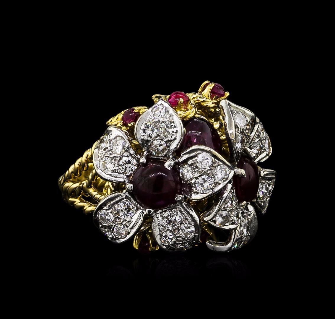 One electronically tested 18KT white and yellow gold ladies cast & assembled ruby and diamond flower ring. The ring features two ruby and diamond set flowers supported by an elaborate ruby accented under gallery and three-way split shoulders, completed by a three millimeter wide band. Bright polish finish with rope and milgrain detailing. Condition is good. Containing: One prong set oval cabochon cut natural ruby, measuring 6.50 x 5.50 x 1.95mm, approximate weight of 0.85ct., clarity is heavily included, type II, medium dark, very slightly brownish, slightly purplish red color, (GIA slpR 6/3), cut is good. Transmitting light somewhat diffusely, translucent. Naturally occurring internal & external characteristics are present. Graded in the setting. Two prong set round cabochon cut natural rubies, measuring 5.80 x 5.70 x 2.40mm, approximate total weight of 1.82ct., clarity is heavily included, type II, medium dark, very slightly brownish, slightly purplish red color, (GIA slpR 6/3), cut is good. Transmitting light somewhat diffusely, translucent. Naturally occurring internal & external characteristics are present. Color grade is an average for the pair. Graded in the setting. Five prong set round cabochon cut natural rubies, measuring 2.50 x 2.40 x 1.00mm, approximate total weight of 0.40ct., clarity is heavily included, type II, medium dark, very slightly brownish, slightly purplish red color, (GIA slpR 6/3), cut is good. Transmitting light somewhat diffusely, translucent. Naturally occurring internal & external characteristics are present. Color grade is an average for the group. Graded in the setting. Forty bead set round brilliant cut diamonds, measuring 2.20 - 2.00 x 1.26mm (depth est.) approximate total weight of 40 Stones = 1.45ct. Graded in the setting. Clarity: SI-1 to I-1. Color: G - I. Total Weight of Colored Stones 3.07ct. Total Weight of Diamonds 1.45ct. Total Weight of Ring 15.53gm. AIG Appraised at $8,215.00.