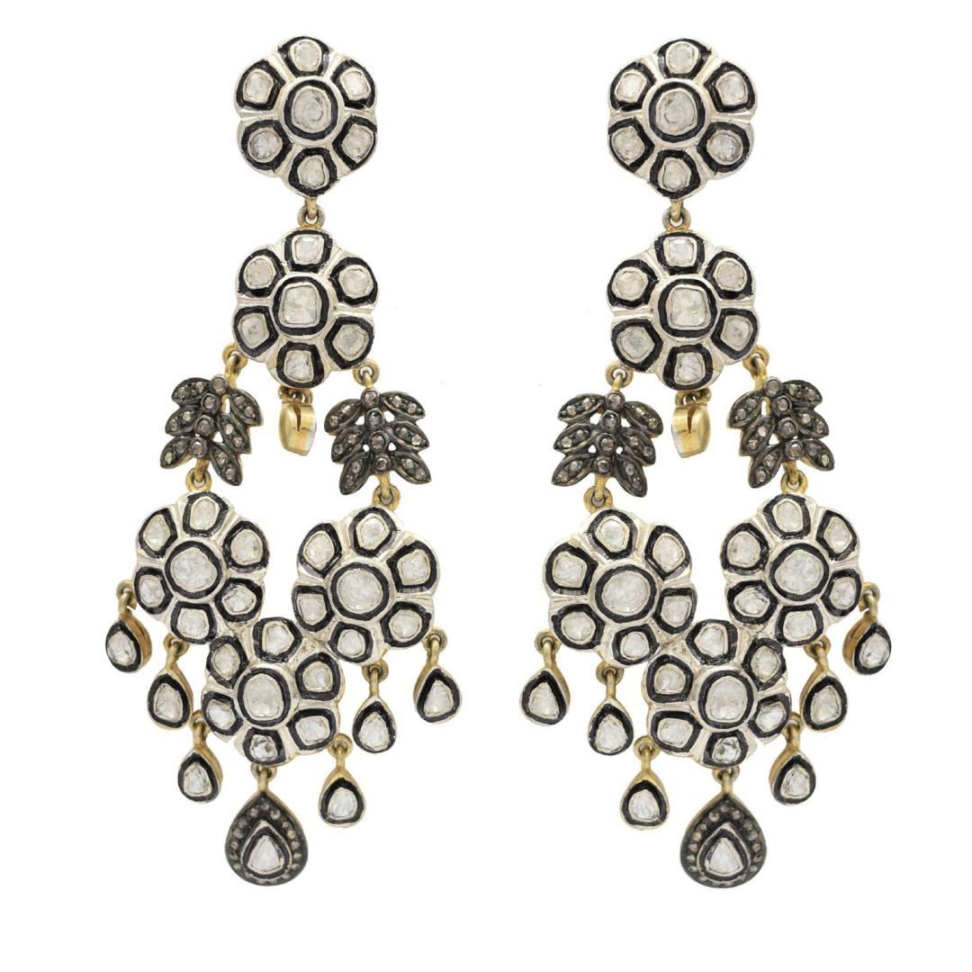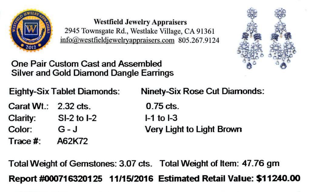 One pair electronically tested silver and gold ladies custom cast & assembled diamond dangle earrings with omega backs. Each earring features a dangling chandelier of diamond florets with diamond fringe completed by a diamond floret post. Bright and anodized finish. Condition is new, good workmanship. Eighty-Six illusion set rose tablet cut diamonds (depth est.) approximate total weight of 86 Stones = 2.32ct. Graded in the setting. Each diamond is bezel set and fitted over foil backs. This was a popular method of illusion setting in the seventeenth and eighteenth centuries. The final appearance of the diamond is that of a much larger stone, an illusion. Clarity SI-2 to I-2 Color G - J Ninety-Six bead set rose cut diamonds (depth est.) approximate total weight of 96 Stones = 0.75ct. The group contains a mix of very light to light brown color diamonds. Graded in the setting. Clarity I-1 to I-3