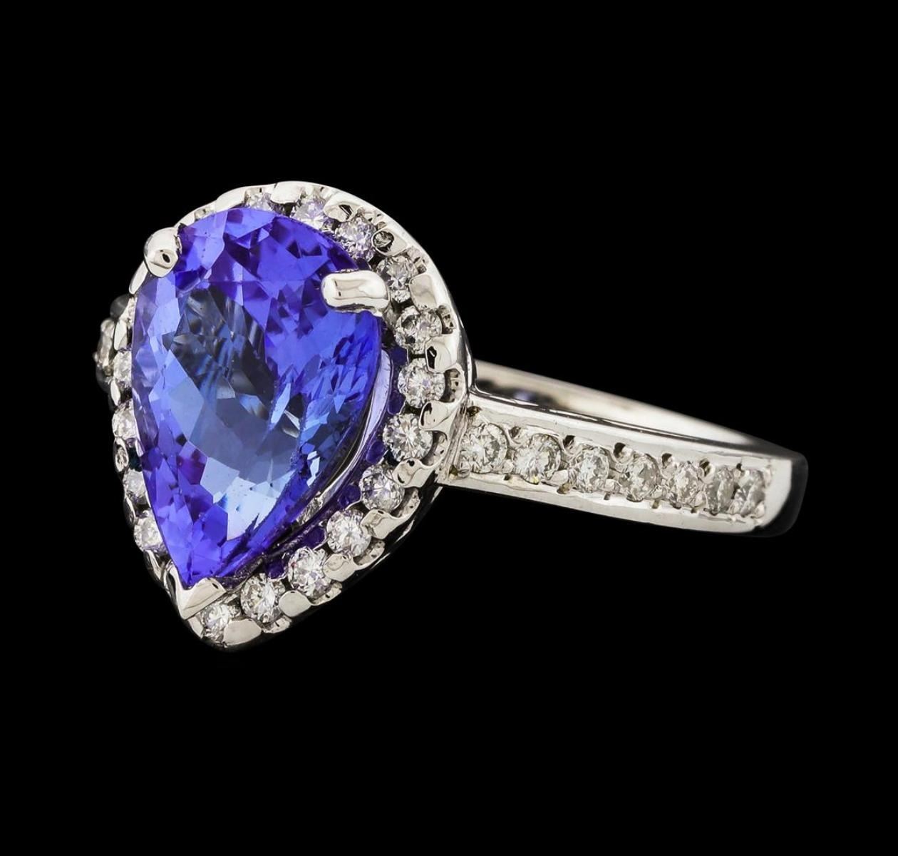 One electronically tested 14KT white gold lady's cast fashion ring with a cathedral shank with a halo with a bright polish finish. The featured lady's ring has a shank measuring 2.22 millimeters wide. Identified with markings of '14K'. Condition is new, good workmanship. Containing: One prong set pear modified brilliant cut natural tanzanite, measuring 11.10 x 8.20 x 5.46mm, (depth est.) approximate weight of 3.07ct., clarity is eye clean, medium light, moderately strong, violetish blue color, (GIA vB 4/4), cut is good. Transmitting light with no distortion, transparent. Colored gemstones are presumed to have been subjected to commonly used enhancement processes. Graded in the setting. Thirty-Four prong set round brilliant cut diamonds, measuring 1.50 - 1.40 x 0.90mm (depth est.) approximate total weight of 34 Stones = 0.40ct. Graded in the setting. Clarity SI-1 to SI-2. Color: G - I Cut Good. Total Weight of Colored Stones 3.07ct.. Total Weight of Diamonds 0.40ct.. Total Weight of Ring 5.50gm. GAS Appraised.