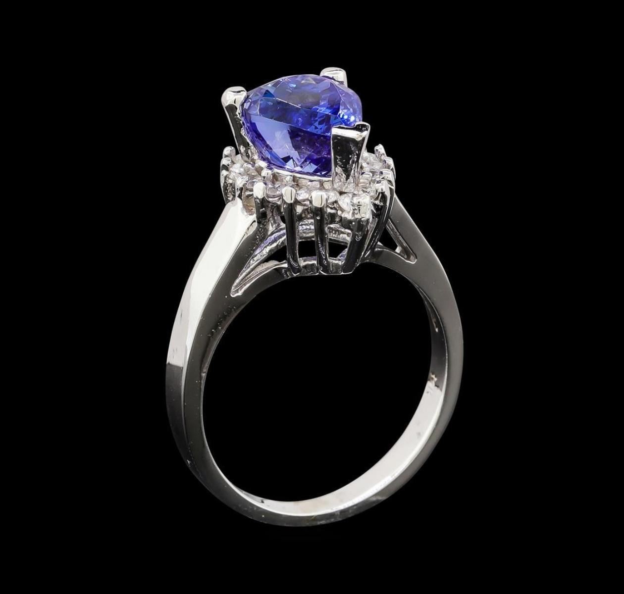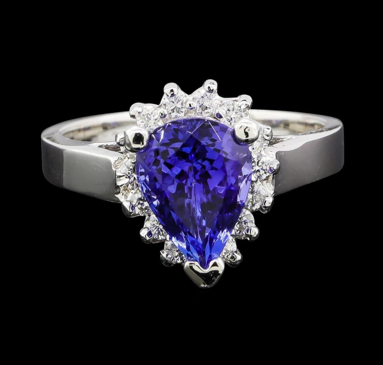 One electronically tested 14KT white gold lady's cast fashion ring with a basket halo with a bright polish finish. The featured lady's ring has a shank measuring 2.58 millimeters wide. Identified with markings of '14K'. Condition is new, good workmanship. Containing: One prong set pear modified brilliant cut natural tanzanite, measuring 10.00 x 7.57 x 6.59mm, (depth est.) approximate weight of 3.07ct., clarity is eye clean, medium dark, strong, violetish blue color, (GIA vB 6/5), cut is very good. Transmitting light with no distortion, transparent. Colored gemstones are presumed to have been subjected to commonly used enhancement processes. Graded in the setting. Fifteen prong set round brilliant cut diamonds, measuring 1.90 - 1.80 x 1.11mm (depth est.) approximate total weight of 15 Stones = 0.35ct. Graded in the setting. Clarity SI-1 to SI-2. Color: G - H Cut Good. Total Weight of Colored Stones 3.07ct.. Total Weight of Diamonds 0.35ct.. Total Weight of Ring 6.00gm.