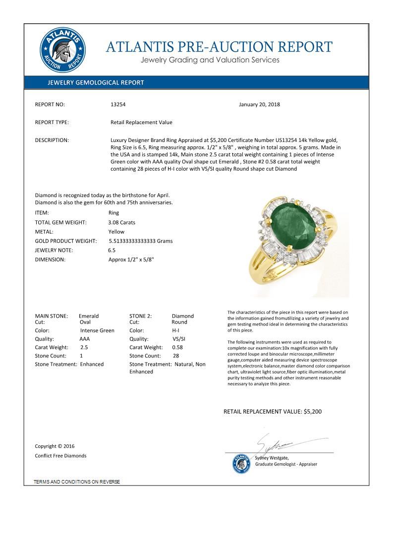REF-78M9H -13254 ---- 3.08 CTW Emerald & Diamond Ring 14K Yellow Gold ---- Luxury Designer Brand Ring Appraised at $5,200 Certificate Number US13254 14k Yellow gold, Ring Size is 6.5, Ring measuring approx. 1/2" x 5/8" , weighing in total approx. 5 grams. Made in the USA and is stamped 14k, Main stone 2.5 carat total weight containing 1 pieces of Intense Green color with AAA quality Oval shape cut Emerald , Stone #2 0.58 carat total weight containing 28 pieces of H-I color with VS/SI quality Round shape cut Diamond