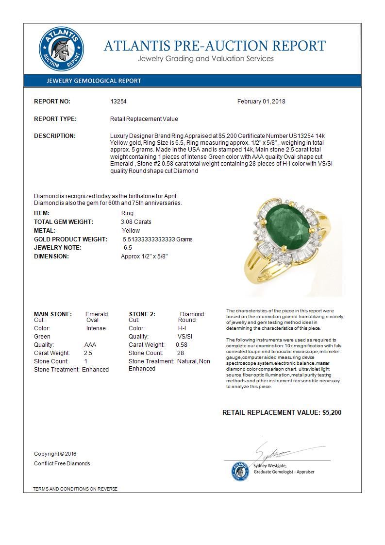 REF-78M9H -13254 ---- 3.08 CTW Emerald & Diamond Ring 14K Yellow Gold ---- Luxury Designer Brand Ring Appraised at $5,200 Certificate Number US13254 14k Yellow gold, Ring Size is 6.5, Ring measuring approx. 1/2" x 5/8" , weighing in total approx. 5 grams. Made in the USA and is stamped 14k, Main stone 2.5 carat total weight containing 1 pieces of Intense Green color with AAA quality Oval shape cut Emerald , Stone #2 0.58 carat total weight containing 28 pieces of H-I color with VS/SI quality Round shape cut Diamond