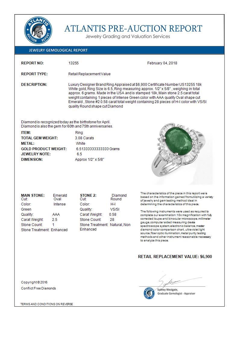 REF-96Y8K -13255 ---- 3.08 CTW Emerald & Diamond Ring 18K White Gold ---- Luxury Designer Brand Ring Appraised at $6,900 Certificate Number US13255 18k White gold, Ring Size is 6.5, Ring measuring approx. 1/2" x 5/8" , weighing in total approx. 6 grams. Made in the USA and is stamped 18k, Main stone 2.5 carat total weight containing 1 pieces of Intense Green color with AAA quality Oval shape cut Emerald , Stone #2 0.58 carat total weight containing 28 pieces of H-I color with VS/SI quality Round shape cut Diamond