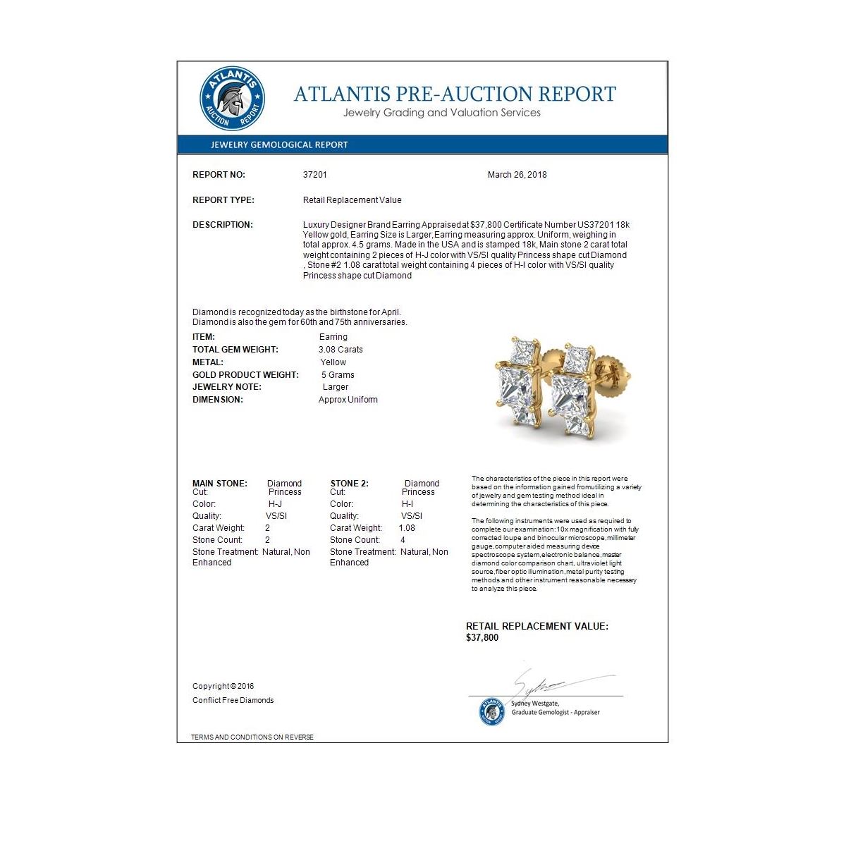 REF-668M2H -37201 ---- 3.08 CTW Princess VS/SI Diamond Art Deco Stud Earrings 18K Yellow Gold ---- Luxury Designer Brand Earring Appraised at $37,800 Certificate Number US37201 18k Yellow gold, Earring Size is Larger, Earring measuring approx. Uniform, weighing in total approx. 4.5 grams. Made in the USA and is stamped 18k, Main stone 2 carat total weight containing 2 pieces of H-J color with VS/SI quality Princess shape cut Diamond , Stone #2 1.08 carat total weight containing 4 pieces of H-I color with VS/SI quality Princess shape cut Diamond