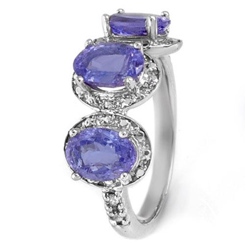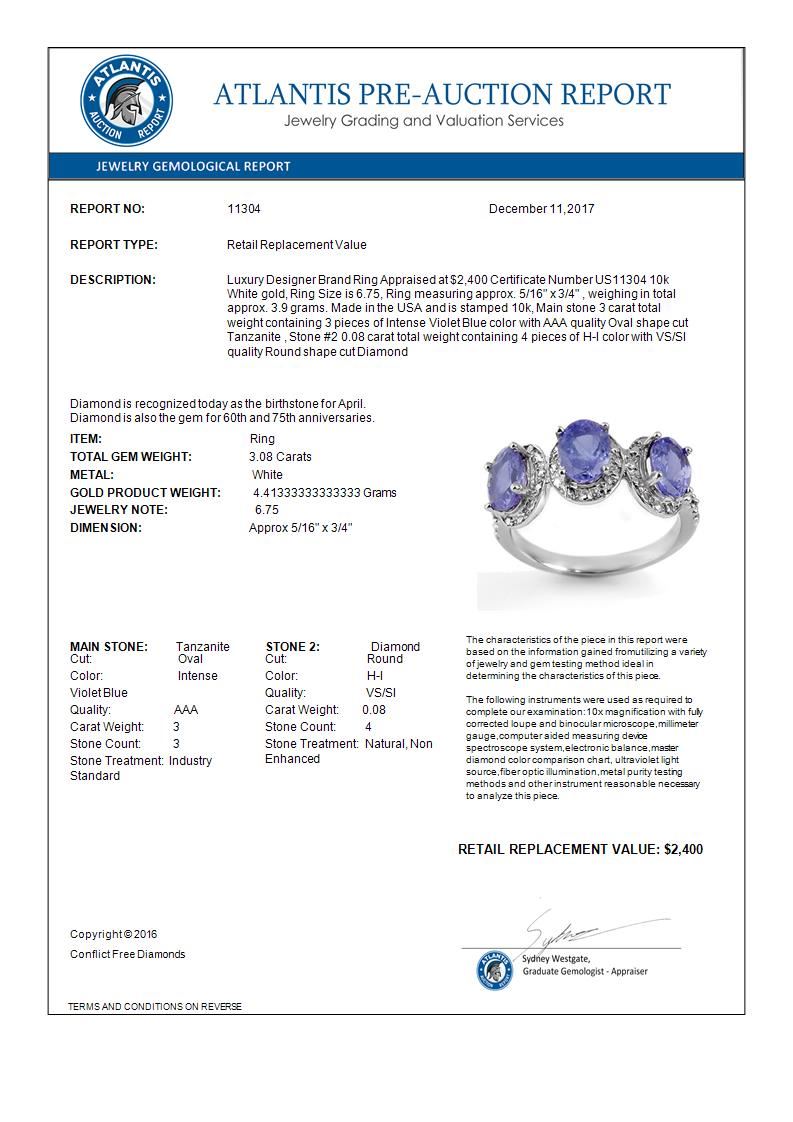 REF-33Y6K -11304 ---- 3.08 CTW Tanzanite & Diamond Ring 10K White Gold ---- Luxury Designer Brand Ring Appraised at $2,400 Certificate Number US11304 10k White gold, Ring Size is 6.75, Ring measuring approx. 5/16" x 3/4" , weighing in total approx. 3.9 grams. Made in the USA and is stamped 10k, Main stone 3 carat total weight containing 3 pieces of Intense Violet Blue color with AAA quality Oval shape cut Tanzanite , Stone #2 0.08 carat total weight containing 4 pieces of H-I color with VS/SI quality Round shape cut Diamond