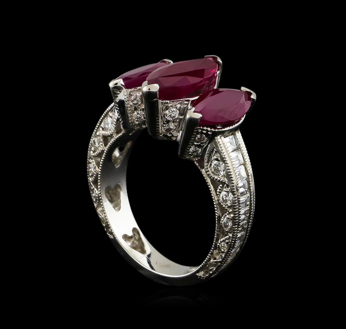 One electronically tested 18KT white gold lady's cast fashion ring with a bright polish with milgrain detailing finish. The featured lady's ring has a shank measuring 3.38 millimeters wide. Identified with markings of "18K". Condition is new, good workmanship. Containing: One prong set marquise modified brilliant cut natural ruby, measuring 11.15 x 5.25 x 3.13mm, approximate weight of 1.40ct., clarity is heavily included, type II, medium dark, moderately strong, red color, (GIA R 6/4), cut is good. Transmitting light somewhat diffusely, semi-transparent to translucent. Naturally occurring internal & external characteristics are present. Indications of laboratory high temperature heat treatment, with glass & flux additives. Graded in the setting. Two prong set marquise modified brilliant cut natural rubies, measuring 8.65 x 4.55 x 2.82mm, approximate total weight of 1.68ct., clarity is heavily included, type II, medium dark, moderately strong, red color, (GIA R 6/4), cut is good. Transmitting light somewhat diffusely, semi-transparent to translucent. Naturally occurring internal & external characteristics are present. Indications of laboratory high temperature heat treatment, with glass & flux additives. Graded in the setting. Twenty-Four channel set baguette cut diamonds, measuring from 1.70 x 1.40 x 1.05mm (depth est.) to 2.10 x 1.70 x 1.28mm (depth est.) approximate total weight of 24 Stones = 0.75ct. Graded in the setting. Clarity: VS-2 to SI-1. Color: G - Very Good Forty-Four prong set round brilliant cut diamonds, measuring 1.70 - 1.00 x 0.81mm (depth est.) approximate total weight of 44 Stones = 0.31ct. Graded in the setting. Clarity: VS-2 to SI-1. Color: G - Very Good. Total Weight of Colored Stones 3.08ct. Total Weight of Diamonds 1.06ct. Total Weight of Ring 6.80gm GAS Appraised at $6,210.00.