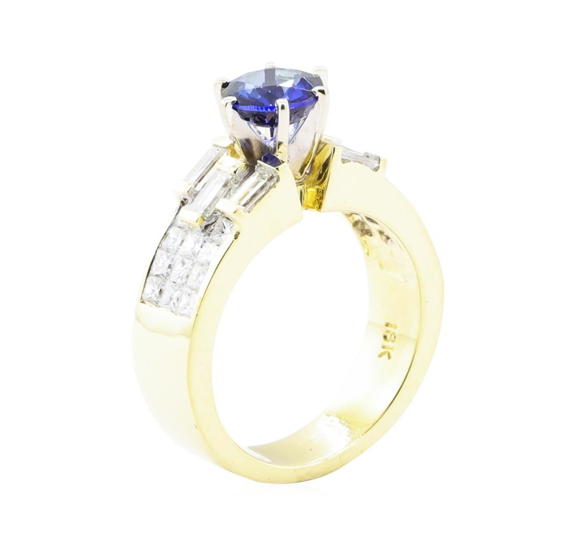 One electronically tested 18KT yellow gold lady's cast fashion ring with a cathedral shank with a bright polish finish. The featured lady's ring has a shank measuring 5.00 millimeters wide. Identified with markings of '18K'. Condition is new, good workmanship. Containing: One prong set round modified mixed cut natural blue sapphire, measuring 6.88 - 6.80 x 3.80 mm, (depth est.) approximate weight of 1.45ct., clarity is eye clean, medium dark, moderately strong, blue color, (GIA B 6/4), cut is very good. Transmitting light with no distortion, transparent. Colored gemstones are presumed to have been subjected to commonly used enhancement processes. Graded in the setting. Six prong set baguette cut diamonds, measuring from 3.40 x 1.90 x 1.62mm (depth est.) to 3.60 x 2.20 x 1.87mm (depth est.) approximate total weight of 6 Stones = 0.68ct. Graded in the setting. Color G - H Clarity VS-1 to VS-2 Cut Very Good Twenty-Two invisible set princess cut diamonds, measuring 1.95 x 1.90 x 1.43mm (depth est.) approximate total weight of 22 Stones = 0.95ct. Graded in the setting. Color G - H Clarity VS-1 to VS-2 Cut Very Good. Total Weight of Colored Stones 1.45ct.. Total Weight of Diamonds 1.63ct.. Total Weight of Ring 9.90gm GAS Appraised at $7530.00. GAS Appraised.