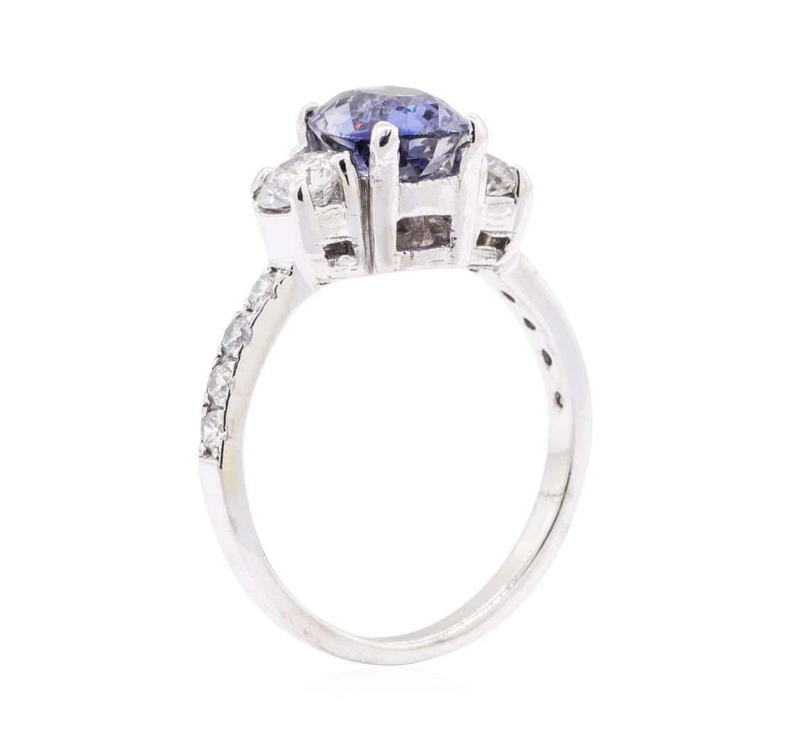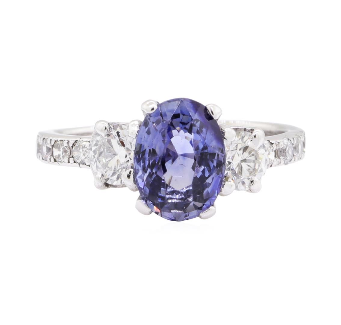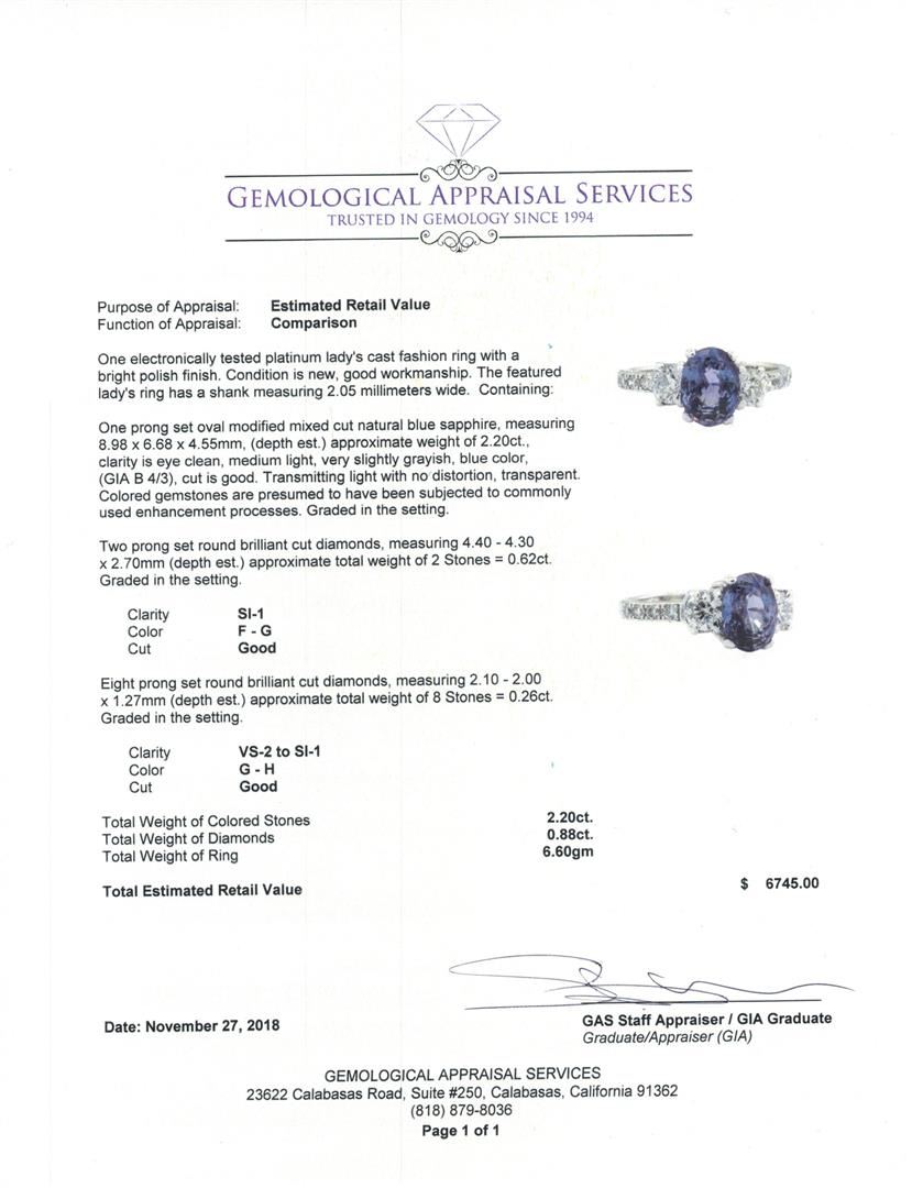One electronically tested platinum lady's cast fashion ring with a bright polish finish. The featured lady's ring has a shank measuring 2.05 millimeters wide. Condition is new, good workmanship. Containing: One prong set oval modified mixed cut natural blue sapphire, measuring 8.98 x 6.68 x 4.55mm, (depth est.) approximate weight of 2.20ct., clarity is eye clean, medium light, very slightly grayish, blue color, (GIA B 4/3), cut is good. Transmitting light with no distortion, transparent. Colored gemstones are presumed to have been subjected to commonly used enhancement processes. Graded in the setting. Two prong set round brilliant cut diamonds, measuring 4.40 - 4.30 x 2.70mm (depth est.) approximate total weight of 2 Stones = 0.62ct. Graded in the setting. Color F - G Clarity SI-1 Cut Good Eight prong set round brilliant cut diamonds, measuring 2.10 - 2.00 x 1.27mm (depth est.) approximate total weight of 8 Stones = 0.26ct. Graded in the setting. Color G - H Clarity VS-2 to SI-1 Cut Good. Total Weight of Colored Stones 2.20ct.. Total Weight of Diamonds 0.88ct.. Total Weight of Ring 6.60gm GAS Appraised at $6745.00. GAS Appraised at $6,745.00.