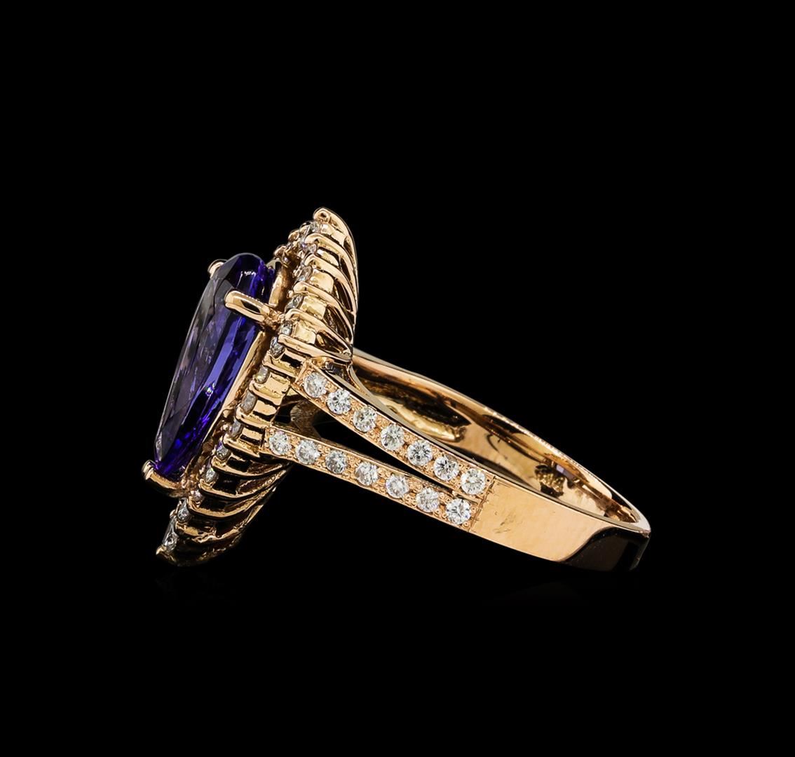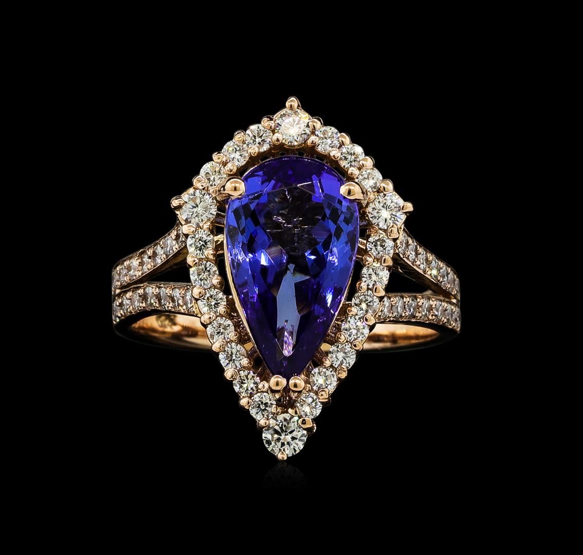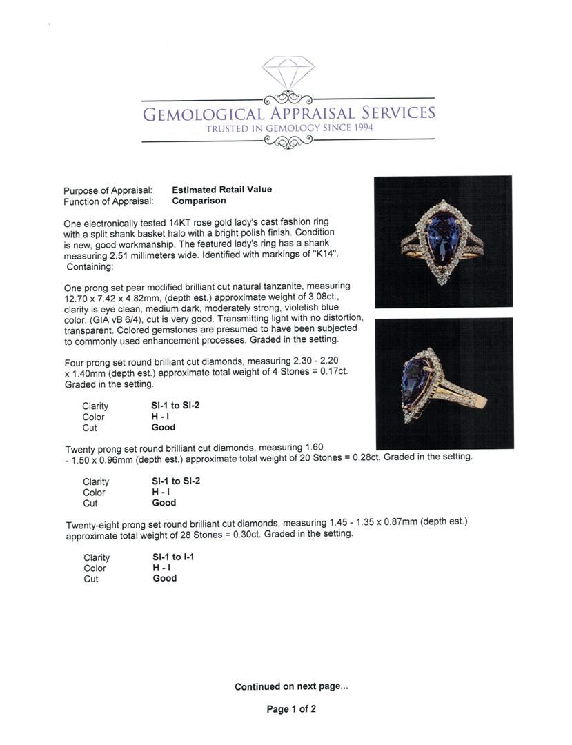 One electronically tested 14KT rose gold lady's cast fashion ring with a split shank basket halo with a bright polish finish. The featured lady's ring has a shank measuring 2.51 millimeters wide. Identified with markings of 'K14'. Condition is new, good workmanship. Containing: One prong set pear modified brilliant cut natural tanzanite, measuring 12.70 x 7.42 x 4.82mm, (depth est.) approximate weight of 3.08ct., clarity is eye clean, medium dark, moderately strong, violetish blue color, (GIA vB 6/4), cut is very good. Transmitting light with no distortion, transparent. Colored gemstones are presumed to have been subjected to commonly used enhancement processes. Graded in the setting. Four prong set round brilliant cut diamonds, measuring 2.30 - 2.20 x 1.40mm (depth est.) approximate total weight of 4 Stones = 0.17ct. Graded in the setting. Clarity SI-1 to SI-2. Color: H - I Cut Good Twenty prong set round brilliant cut diamonds, measuring 1.60 - 1.50 x 0.96mm (depth est.) approximate total weight of 20 Stones = 0.28ct. Graded in the setting. Clarity SI-1 to SI-2. Color: H - I Cut Good Twenty-Eight prong set round brilliant cut diamonds, measuring 1.45 - 1.35 x 0.87mm (depth est.) approximate total weight of 28 Stones = 0.30ct. Graded in the setting. Clarity SI-1 to I-1. Color: H - I Cut Good. Total Weight of Colored Stones 3.08ct.. Total Weight of Diamonds 0.75ct.. Total Weight of Ring 5.90gm GAS Appraised at $8,265.00.