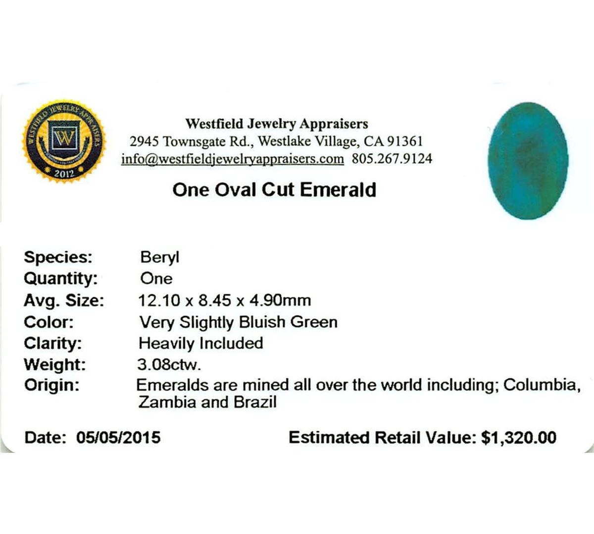 One oval mixed cut natural emerald, measuring 12.10 x 8.45 x 4.90mm, approximate weight of 3.08ct., clarity is heavily included, type III, medium dark, very slightly grayish, very slightly bluish green color, (GIA vslbG 6/3), cut is good. Indications of multiple laboratory enhancements, including high temperature heat treatment. Westfield Appraised at $1,320.00.