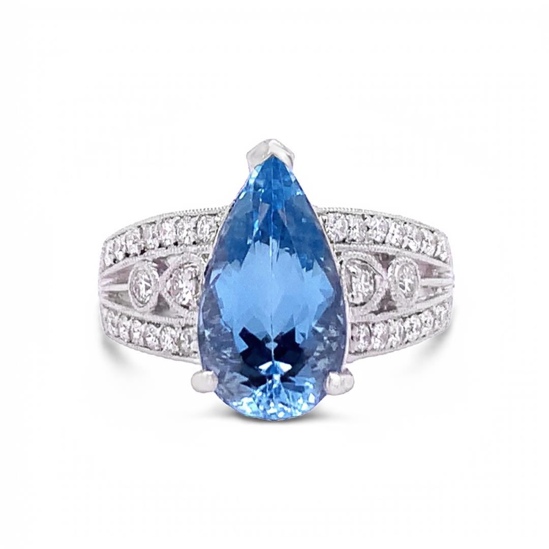 One lady's polished, stamped and electronically tested solid Platinum Ring crafted and signed by Luxury Designer "Orrianne" then mounted with: 1 Natural Pearl Cut Aquamarine (Beryl) centerstone hi-lighted by 30 Genuine Earth Mined Diamonds. This item weighs 9.50 grams and fits a finger size 7.00. The setting measures X13.91 mm and the band measures 8.85 mm to 3.00 mm at the center of the shank. The condition is BRAND NEW. The gemstones have been analyzed in the mounting. #MAIN GEMSTONE# IDENTITY: Natural Aquamarine (Beryl) SHAPE: Pear (Faceted) MEASUREMENTS: 13.30x7.65mm (no depth) QUANTITY: 1 CARAT WEIGHT: 3.09 cts CLARITY TYPE: II=may include eye-visible features HUE: Blue SECONDARY: Sky Blue TRANSPARENCY: Transparent TONE: Medium SATURATION: Vivid-Bright QUALITY: 8-9 Very Good-Excellent #ADJACENT GEMSTONES# IDENTITY: Natural Earth Mined Diamond CUT: Round Full (Faceted) QUANTITY: 30 CARAT WEIGHT: 0.42 ctw CLARITY GRADE: VS-2/SI-1 (Range) COLOR GRADE: F (Average) CUT GRADE: 7 - Very Good (Overall) GEMSTONE CARAT WEIGHT: 3.09 ctw DIAMOND CARAT WEIGHT: 0.42 ctw ITEM GRAM WEIGHT: 9.50 grams