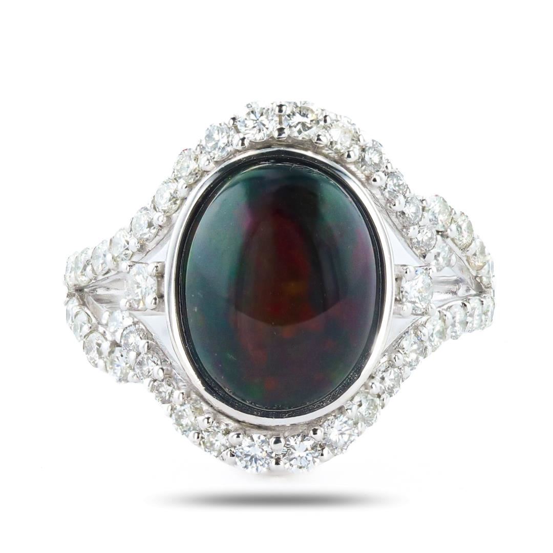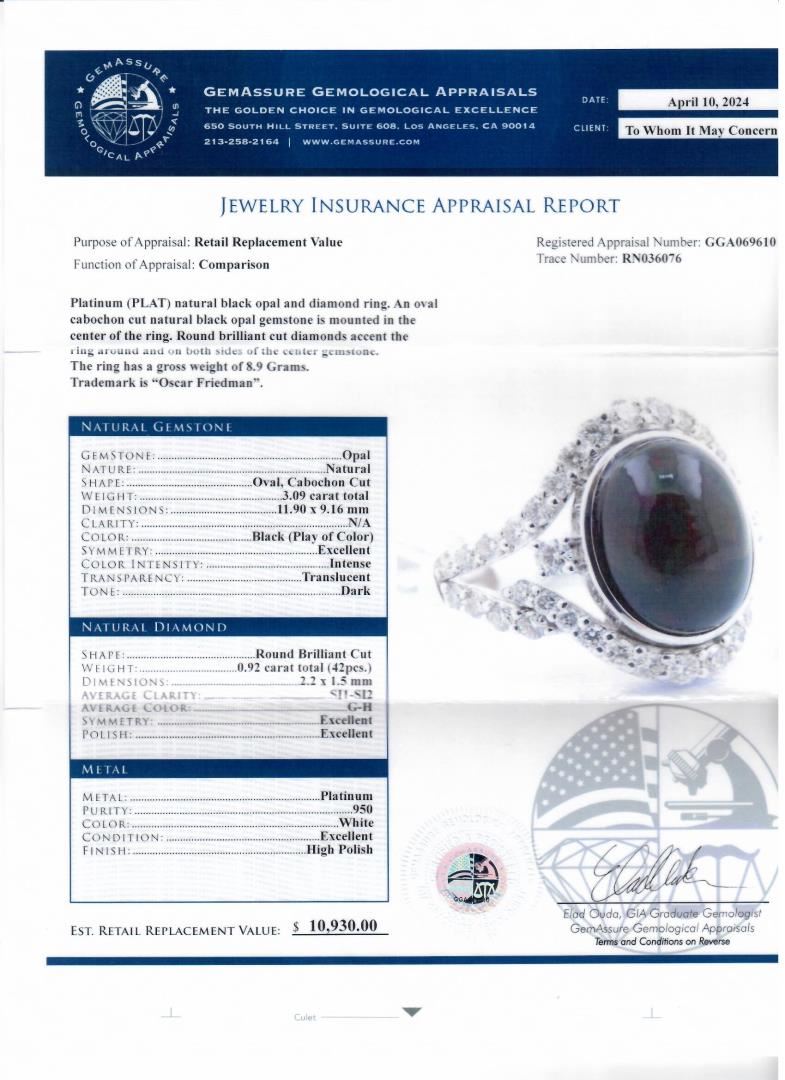 Platinum (PLAT) natural black opal and diamond ring. An oval cabochon cut natural black opal gemstone is mounted in the center of the ring. Round brilliant cut diamonds accent the ring around and on both sides of the center gemstone. The ring has a gross weight of 8.9 Grams. Trademark is "Oscar Friedman". #NATURAL GEMSTONE# GEMSTONE: Opal NATURE: Natural SHAPE: Oval, Cabochon Cut WEIGHT: 3.09 carat total DIMENSIONS: 11.90 x 9.16mm CLARITY: N/A COLOR: Black (Play of Color) SYMMETRY: Excellent COLOR INTENSITY: Intense TRANSPARENCY: Translucent TONE: Dark #NATURAL DIAMOND# SHAPE: Round Brilliant Cut WEIGHT: 0.92 carat total (42pcs.) DIMENSIONS: 2.2 x 1.5mm AVERAGE CLARITY: SI1-SI2 AVERAGE COLOR: G-H SYMMETRY: Excellent POLISH: Excellent #METAL# METAL: Platinum PURITY: 950 COLOR: White CONDITION: Excellent FINISH: High Polish Size: 6 3/4