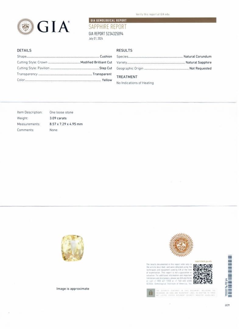 One polished, stamped, and tested 18K white and yellow gold ring marked Oscar Friedman. The ring is mounted with: 1 genuine GIA certified unheated sapphire center stone weighing 3.09 carats, and 46 genuine round diamonds weighing approximately 0.43 carats. This item weighs 4.7 grams, condition is new, excellent workmanship. #MAIN GEMSTONE# GIA Report No. 5234325004# Species: Natural Corundum; Variety: Natural Sapphire; Shape: Cushion; Cutting Style: Modified Brilliant Cut Crown, Step Cut Pavilion; Measurements: 8.57 x 7.29 x 4.95mm; Weight: 3.00 carats; Color: Yellow; Transparency: Transparent; Treatment: None; Refractive Index: 1.762 - 1.770 DR; Birefringence: 0.008 - 0.010; Hardness: 9 #ADJACENT GEMSTONES ON RING# Identity: Natural Diamond; Shape: Round; Cutting Style: Brilliant Cut; Quantity: 46 Diamonds; Measurements: 1.0 - 1.8mm; Total Weight: 0.43 carats; Clarity Grade: VS1-VS2; Color Grade: F-G; Refractive Index: 2.417; Hardness: 10; SAPPHIRE WEIGHT: 3.09 ct; TOTAL DIAMOND WEIGHT: 0.43 cts; WEIGHT OF ITEM: 4.7 grams; GOLD CONTENT: 18K White & Yellow Gold #Size: 7