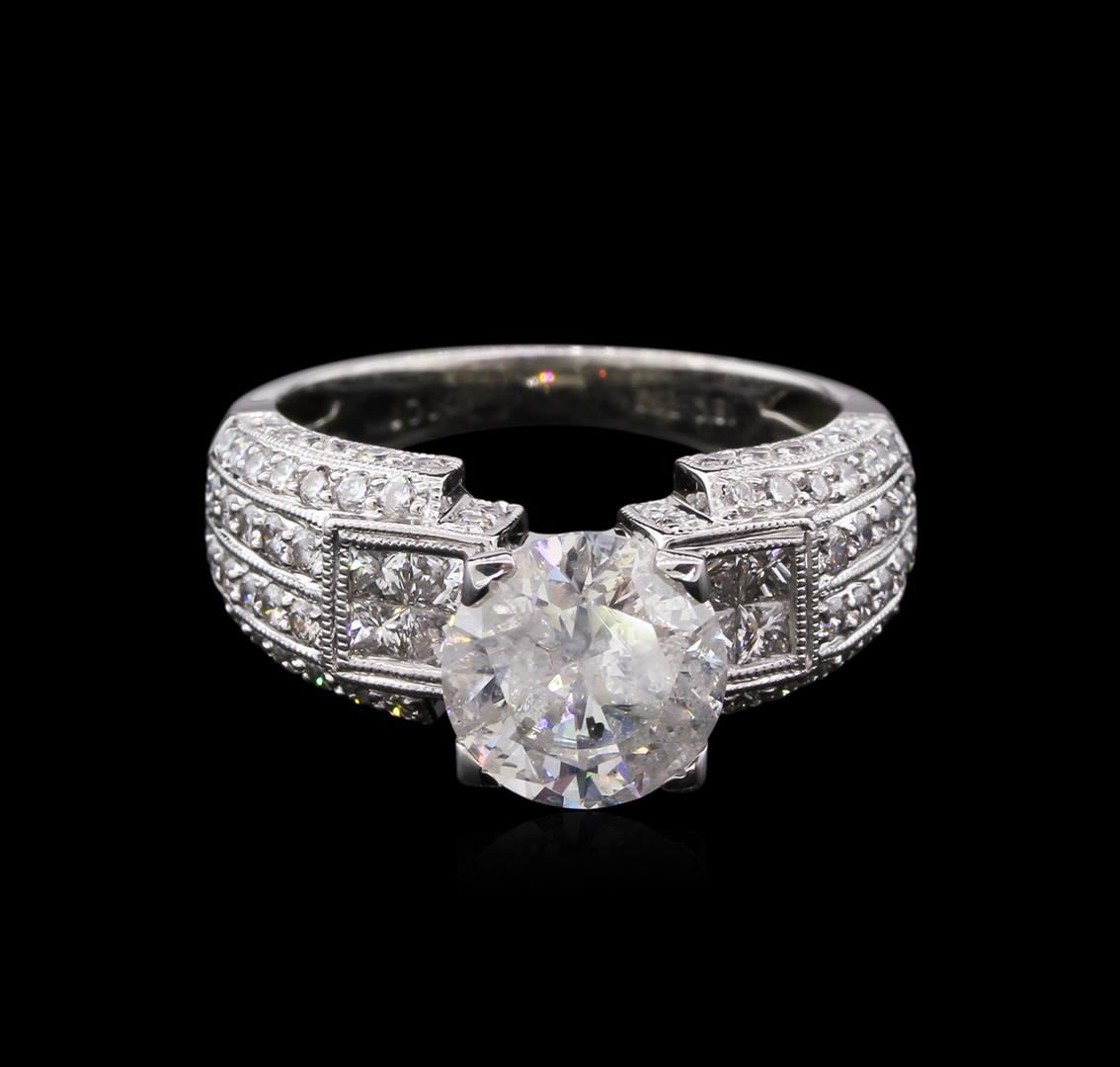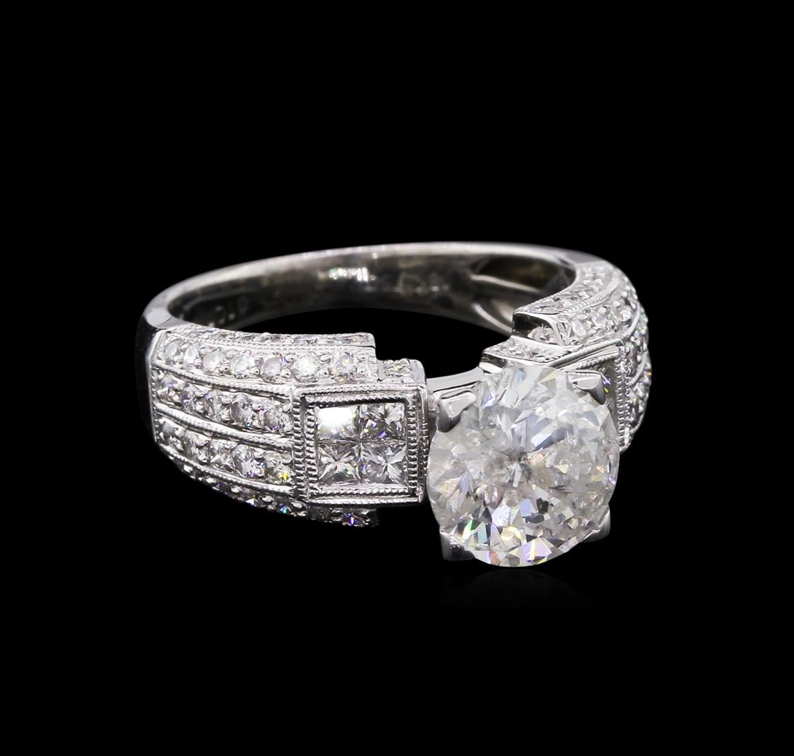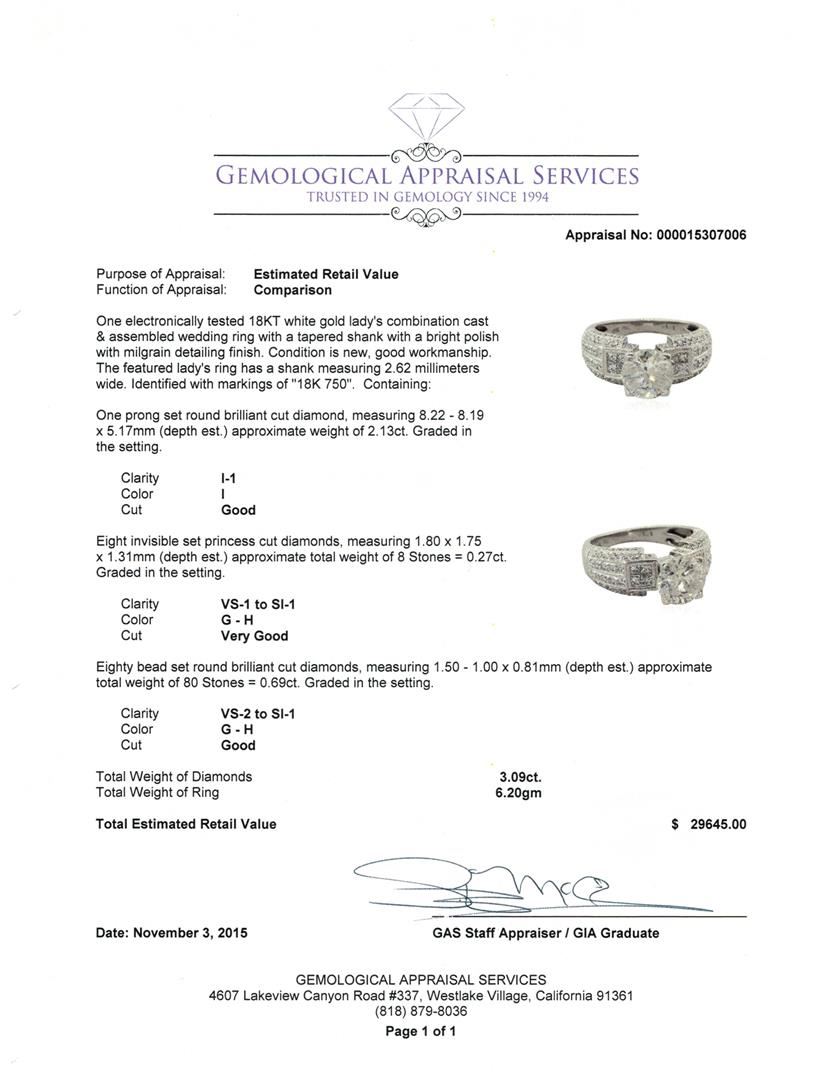 One electronically tested 18KT white gold lady's combination cast & assembled wedding ring with a tapered shank with a bright polish with milgrain detailing finish. The featured lady's ring has a shank measuring 2.62 millimeters wide. Identified with markings of "18K 750". Condition is new, good workmanship. Containing: One prong set round brilliant cut diamond, measuring 8.22 - 8.19 x 5.17mm (depth est.) approximate weight of 2.13ct. Graded in the setting. Clarity: I-1. Color: I. Cut Good Eight invisible set princess cut diamonds, measuring 1.80 x 1.75 x 1.31mm (depth est.) approximate total weight of 8 Stones = 0.27ct. Graded in the setting. Clarity: VS-1 to SI-1. Color: G - Very Good Eighty bead set round brilliant cut diamonds, measuring 1.50 - 1.00 x 0.81mm (depth est.) approximate total weight of 80 Stones = 0.69ct. Graded in the setting. Clarity: VS-2 to SI-1. Color: G - Good. Total Weight of Diamonds 3.09ct. Total Weight of Ring 6.20gm GAS Appraised at $29,645.00.