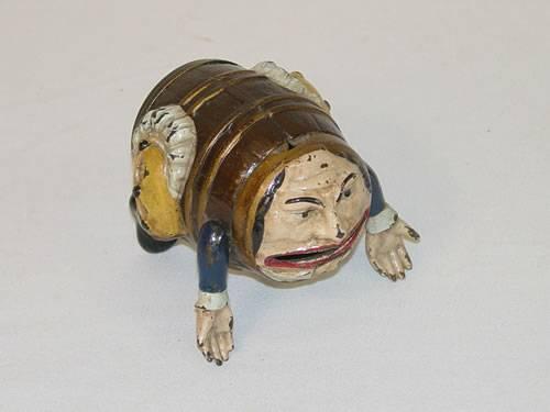 3 1/2" CAST IRON PAINTED MAN IN BARREL STILL BANK BY J & E STEVENS - GOOD PAINT W/ MINOR LOSSES & WEAR;