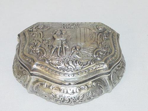 3 1/2" CONTINENTAL SILVER BOX W/ REPOUSSE COURTING SCENE-HALLMARKED, 3 TROY OZ.