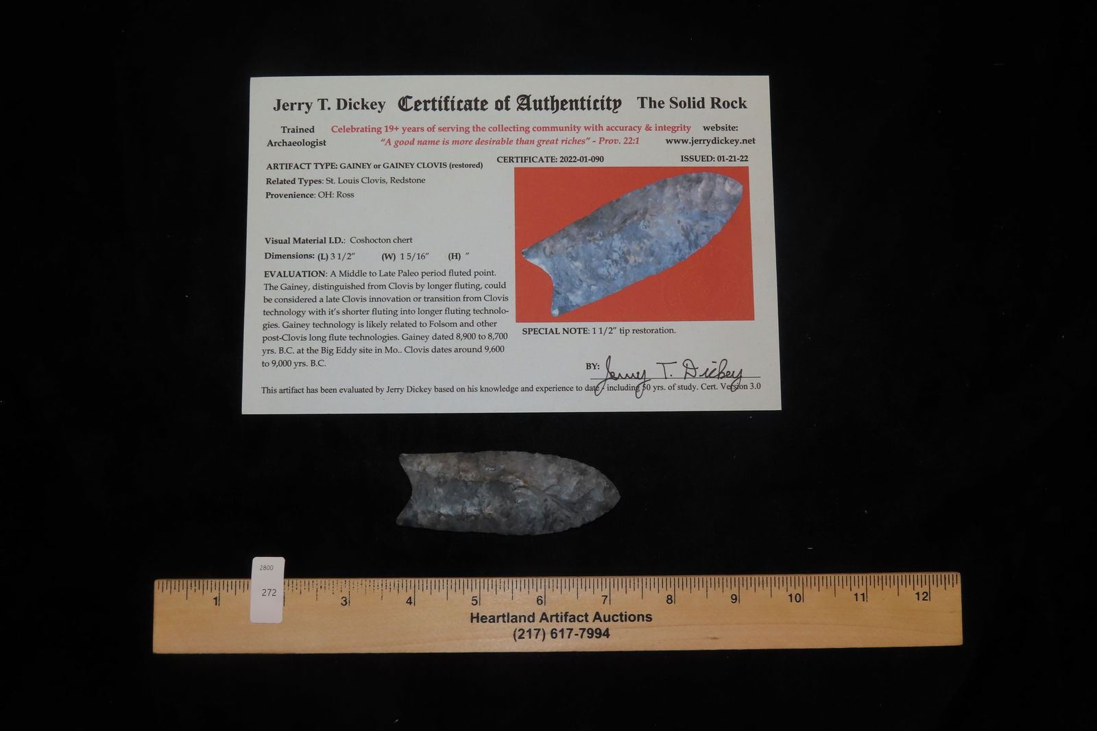 3 1/2& quot; Coshocton Gainey Clovis, Dickey COA, found in Ross Co., Ohio, Restored, Ex. Walt McIntire