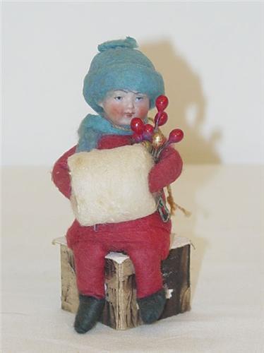 3 1/2" GERMAN BISQUE HEAD CHILD CANDY CONTAINER ORNAMENT-CHILD SEATED W/ RED COTTON & WIRE BODY, WHITE MUFF W/ BLUE HAT & SCARF HOLDING HOLLY BERRIES W/ PAINTED BISQUE HEAD, UNMARKED - MISSING BOTTOM, IMPERFECTIONS