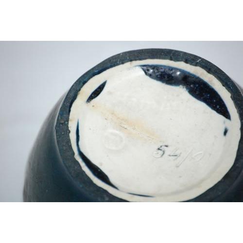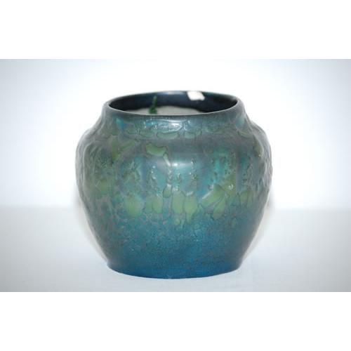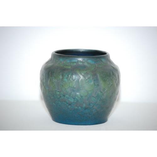 3 1/2" HAMPSHIRE ART POTTERY VASE - BLUE GREEN ALLIGATOR MATTE GLAZE-IMPRESSED MARK ON BASE HAMPSHIRE W/ "M" IN CIRCLE MO 54/O - RIM CHIP ON TOP, WEAR