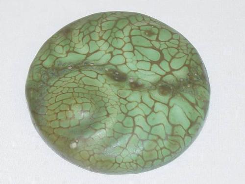 3 1/2" HAMPSHIRE POTTERY MATTE GREEN SCARB PAPERWEIGHT MARKED HAMPSHIRE POTTERY ON BASE W/ "M" IN CIRCLE - SEVERAL SMALL BUBBLE BURSTS