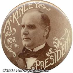 <B>Spectacular 3 1/2" McKinley Button From 1896</B></I> <BR>This gorgeous button was almost certainly made by an Indianapolis manufacturer which put out a number of very fine sepia designs with a similar look during the 1896 and 1900 campaigns. However, we have never encountered this one before. Choice condition. Originally a pinback button which had lost its original pin, but the pin has been skillfully replaced. What a centerpiece for a tray of McKinleys! <BR><BR><B>Important notice:</B> Heritage usually auctions material at the rate of 200-250 lots per hour. On some occasions eBay Live bid software or the Internet may not be able to keep up with the pace of the auction. We recommend placing a realistic absentee bid now as insurance to avoid disappointment. Occasionally the auctioneer may eliminate or reject an eBay Live bid, and the auctioneer may also reopen a lot after the close of the eBay live bidding (usually because we missed an audience bid), and may reject your bid even if it shows you as the winning bidder. By bidding via eBay Live, you agree that Heritage may award the lot to another bidder at its sole discretion under the circumstances described above or any other reasonable circumstances. Since eBay bids are not shown to us until we open the lot on the floor, we treat those bids just like floor bids. In most cases the floor responds before the eBay bid is presented to us, due to Internet lag time, so for consistency we have made it a policy that floor bids are always considered first over tie eBay live bids. Also please note that all Heritage lots purchased through eBay Live carry a 20% Buyer's Premium. Please make sure you read the Terms and Conditions before you bid. Lot:27408