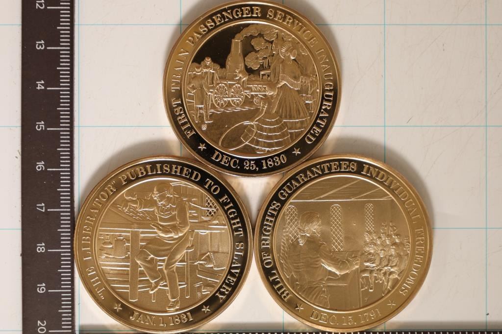 DEPICTING EVENTS IN AMERICAN HISTORY. 1ST TRAIN PASSANGER SERVICE, THE LIBERATOR PUBLISHED TO FIGHT SLAVERY AND BILL OF RIGHTS. EACH IN HARD PLASTIC CAPSULE FROM THE FRANKLIN MINT