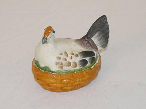 3 1/2" STAFFORDSHIRE BISQUE COVERED HEN ON NEST - PROFESSIONAL REPAIR TO BEAK, WEAR;