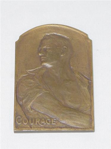 3 1/2" X 2 3/8" DOMED TOP BRONZE PLAQUE "COURAGE" W/ PORTRAIT & DEDICATION ON REVERSE BY AVARD TENNYSON FAIRBANKS, 1933-MEDALLIC ART CO. NY