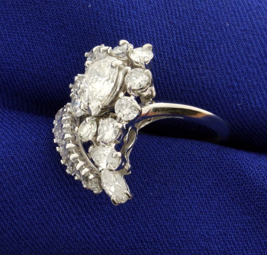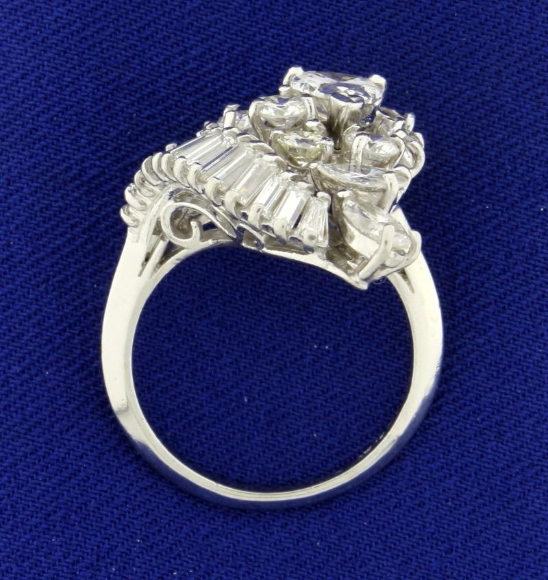 In Platinum. Center diamond is very high quality 1ct pear surrounded by 1ct TW of round diamonds, 3/4 ct TW of marquise diamonds and 3/4 ct TW of baguette diamonds. Center pear is VS clarity/F color. Surrounding diamonds are VS/SI clarity F to G color. 8.7 g.