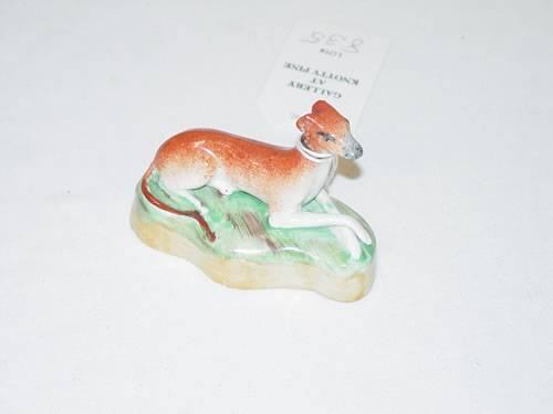 3 1/4" STAFFORDSHIRE RECUMBENT WHIPPET ON PILLOW;