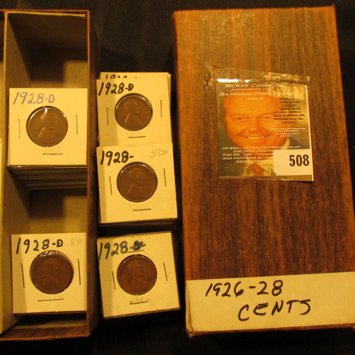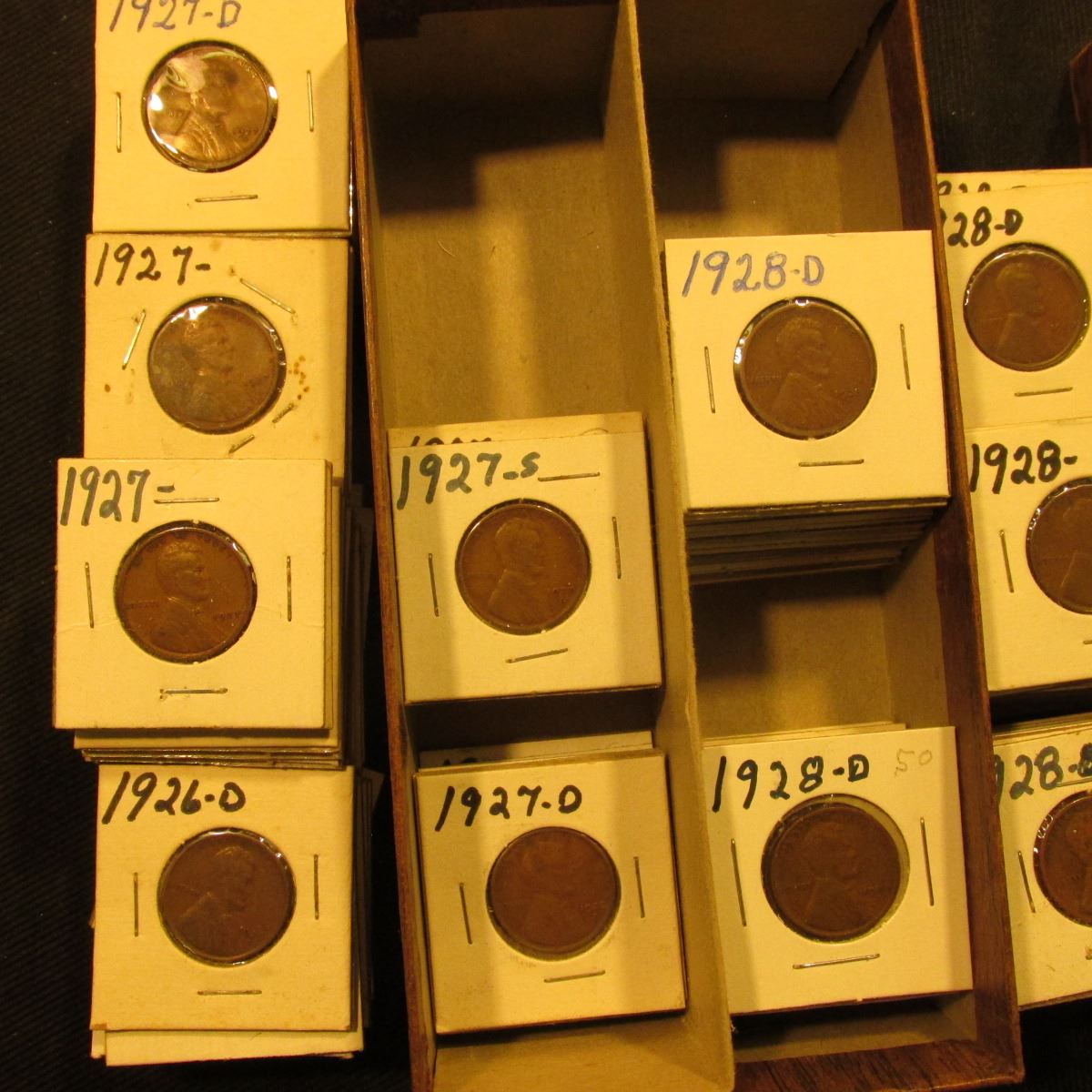 3 1/4" x 6 1/4" double row Stock Box full of Lincoln Cents in holders. Coins date 1926-28.