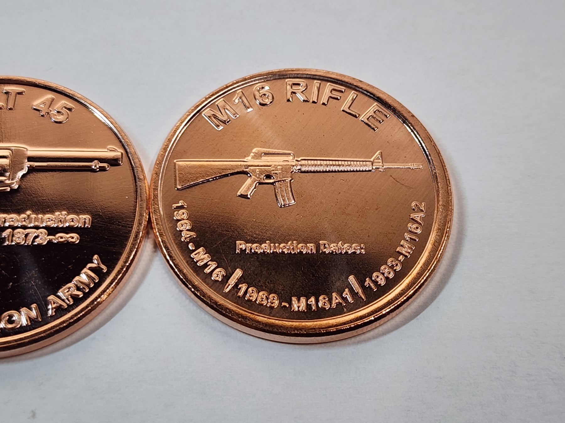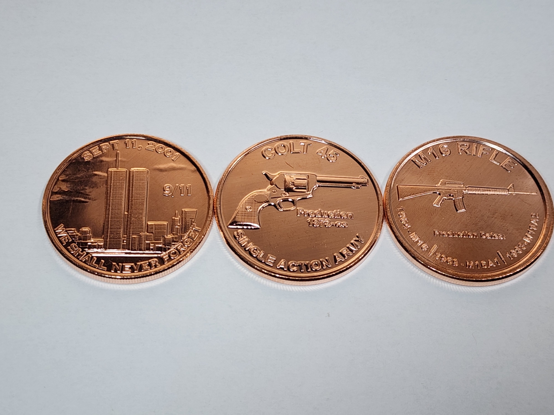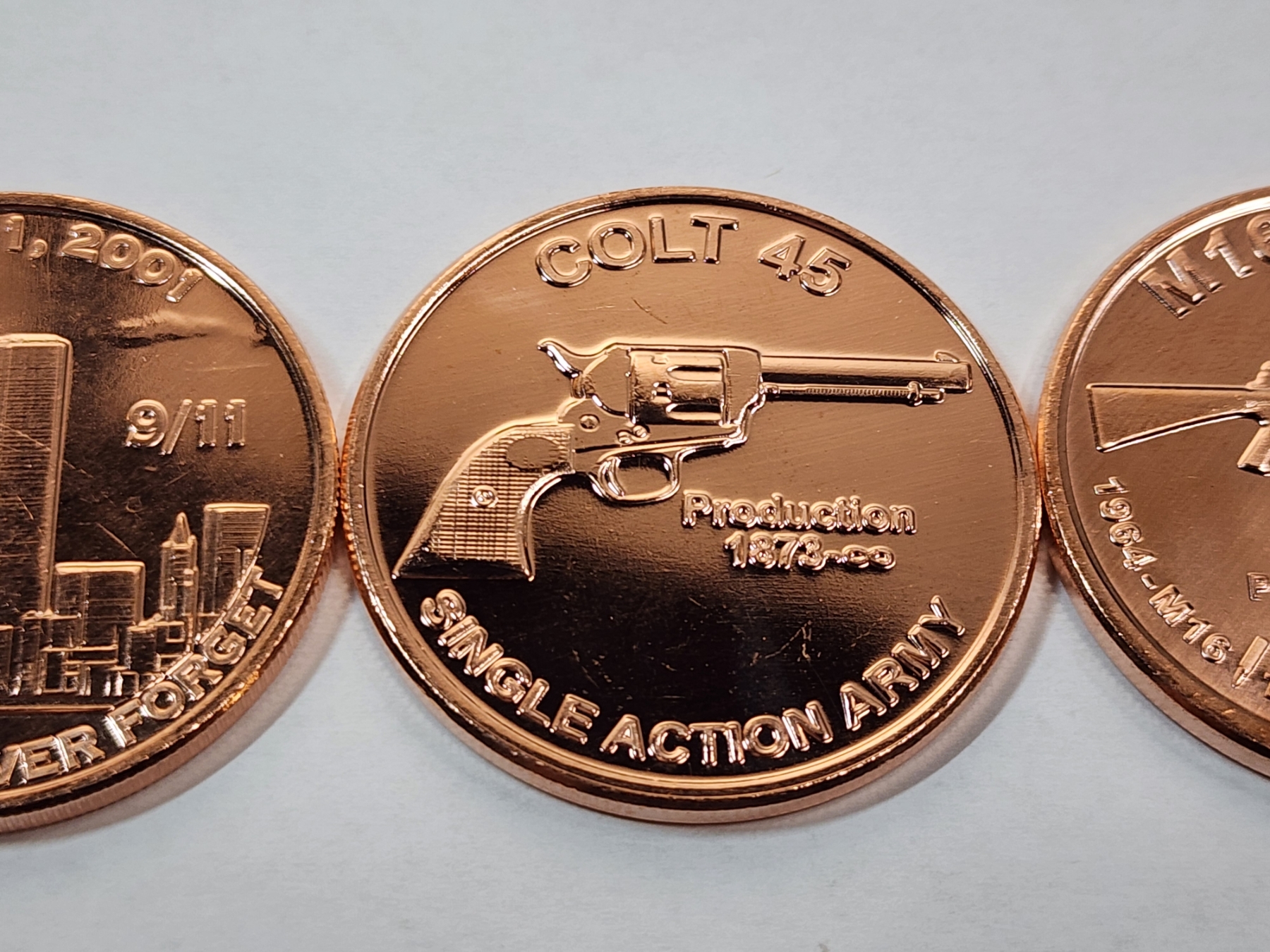 3 - 1 AVDP Ounce .999 Fine Copper Rounds: 9/11, Colt 45, & M16 Rifle Designs (3 oz Total) Mint Cond.